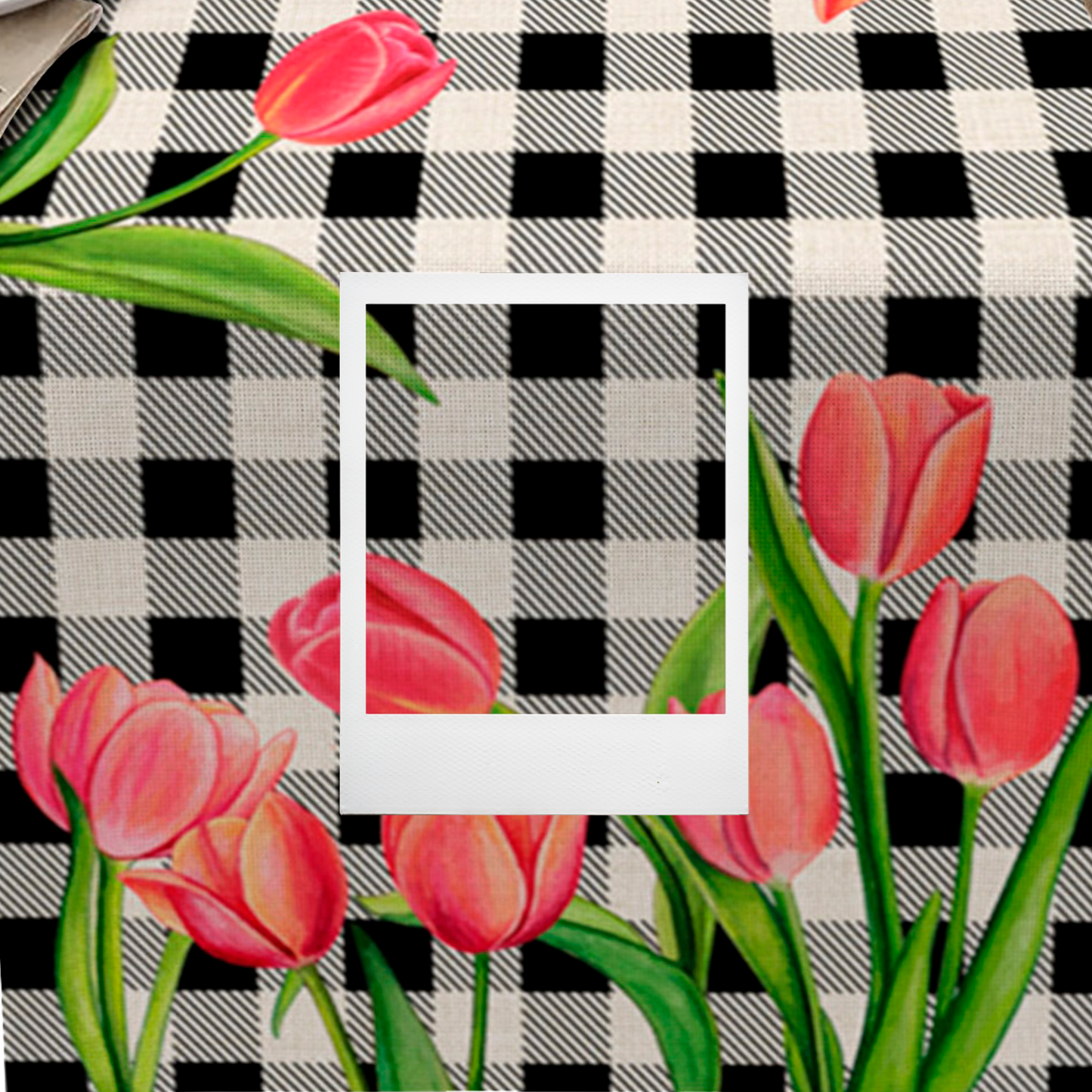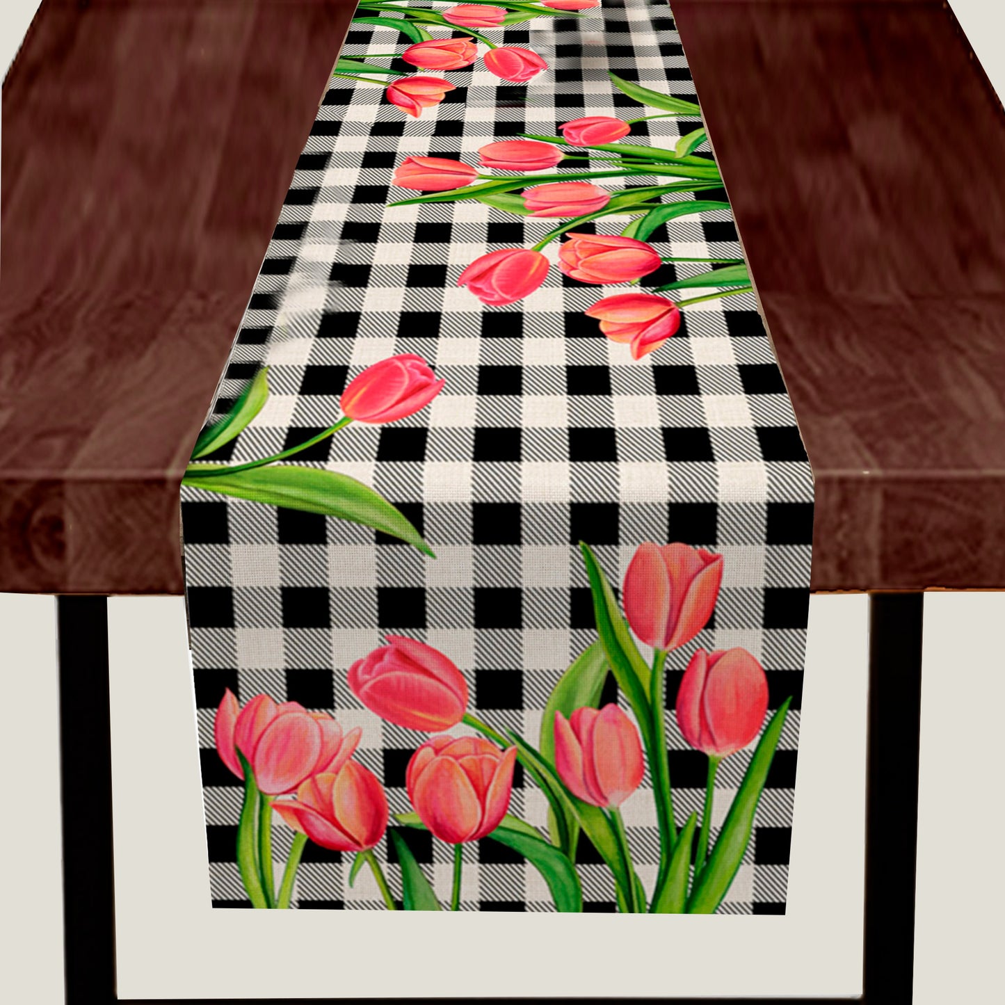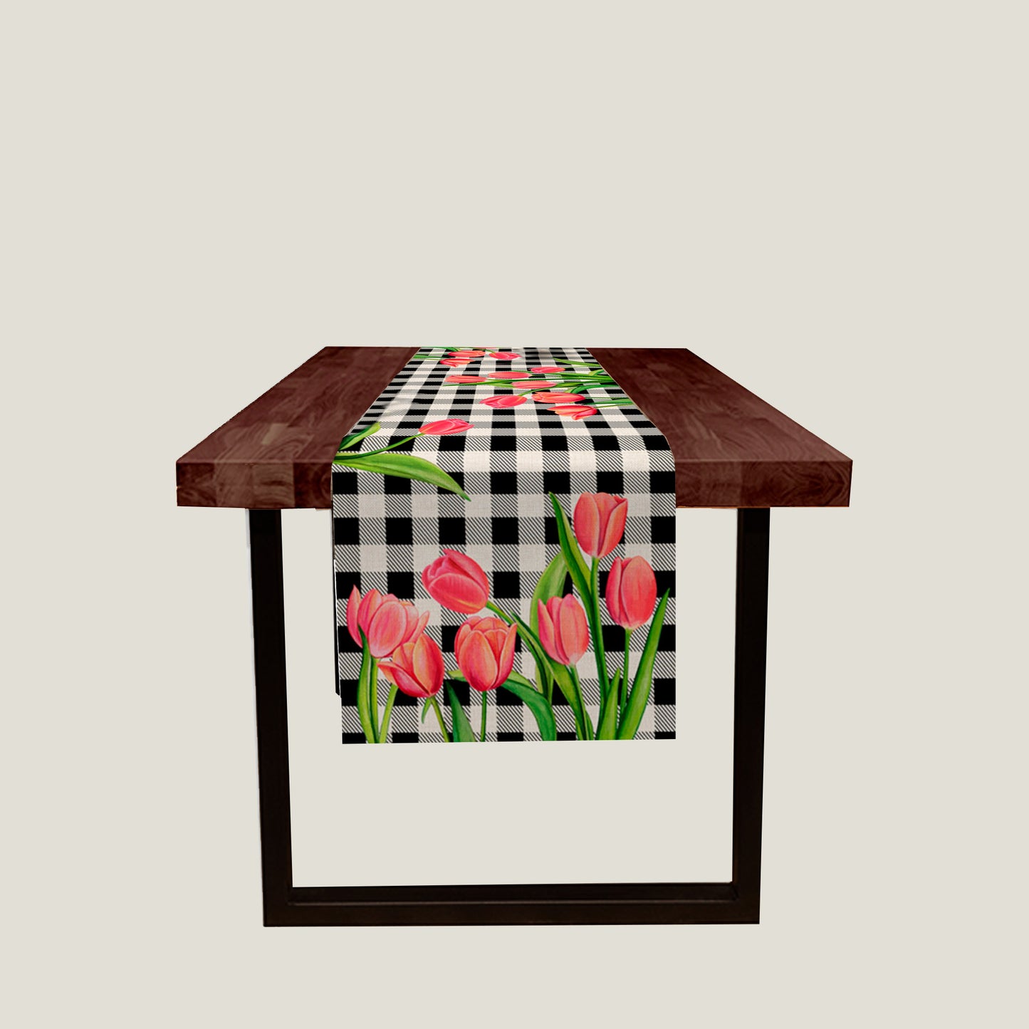 Dieser schwarz karierte Tulpen-Tischläufer verleiht jedem Esszimmer oder jeder Küche sofort neuen Schwung. Die weiche Textur, das farbenfrohe Blumenmuster und das schwarz-weiße Gingham-Karomuster verleihen ihm einen einzigartigen Stil, der garantiert auffällt.