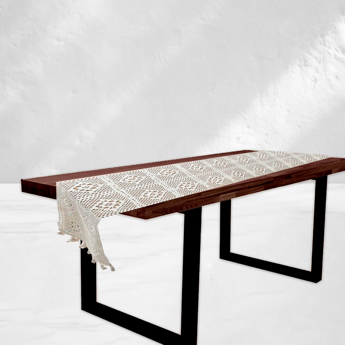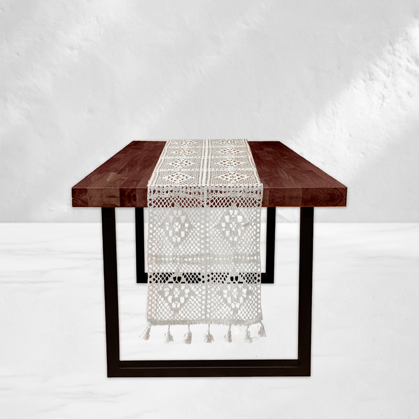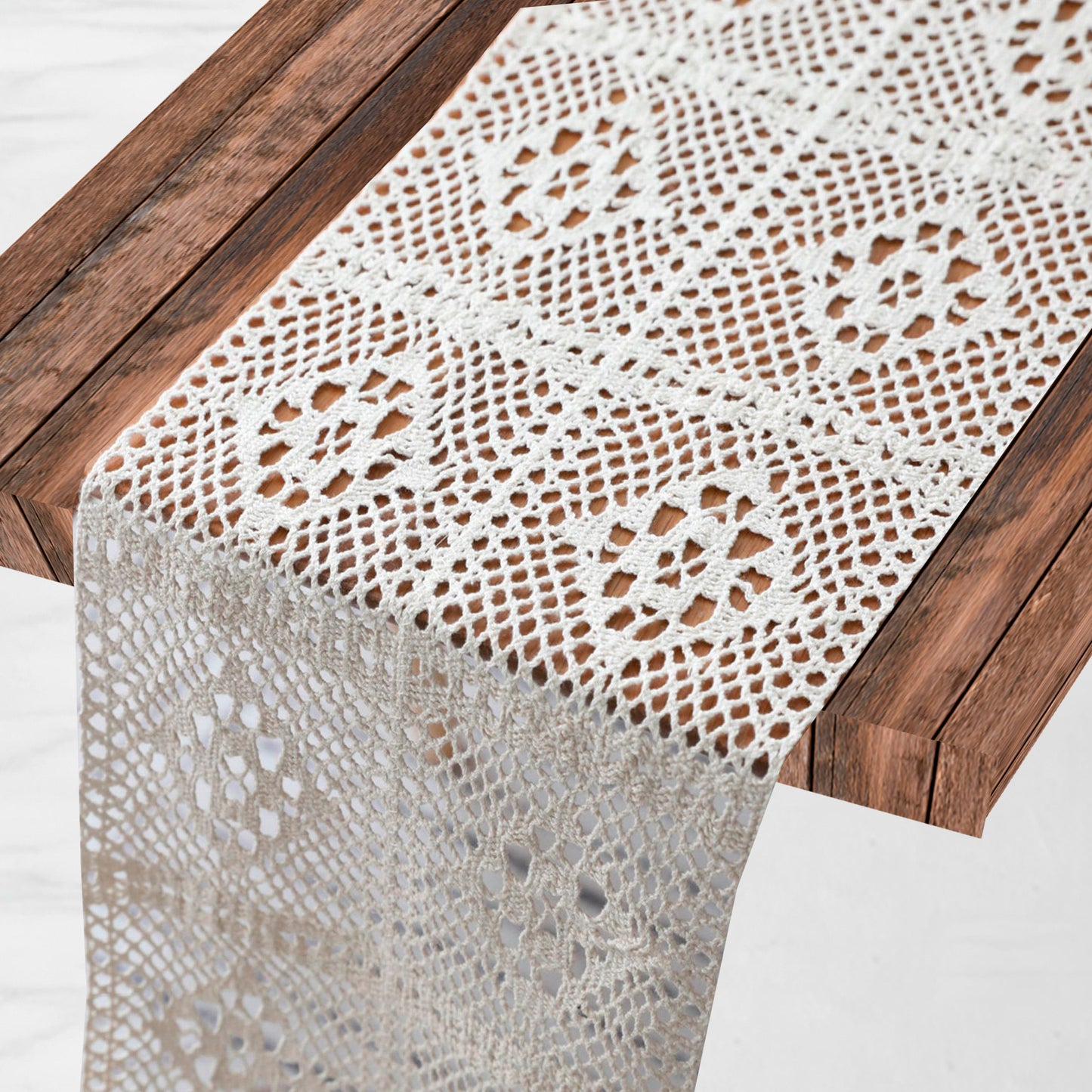 Der Crochet Lace Tisch läufer hat ein sOft glatte Textur Oberfläche mit einem Patchwork Spitze Häkel gestickt Strickmuster.