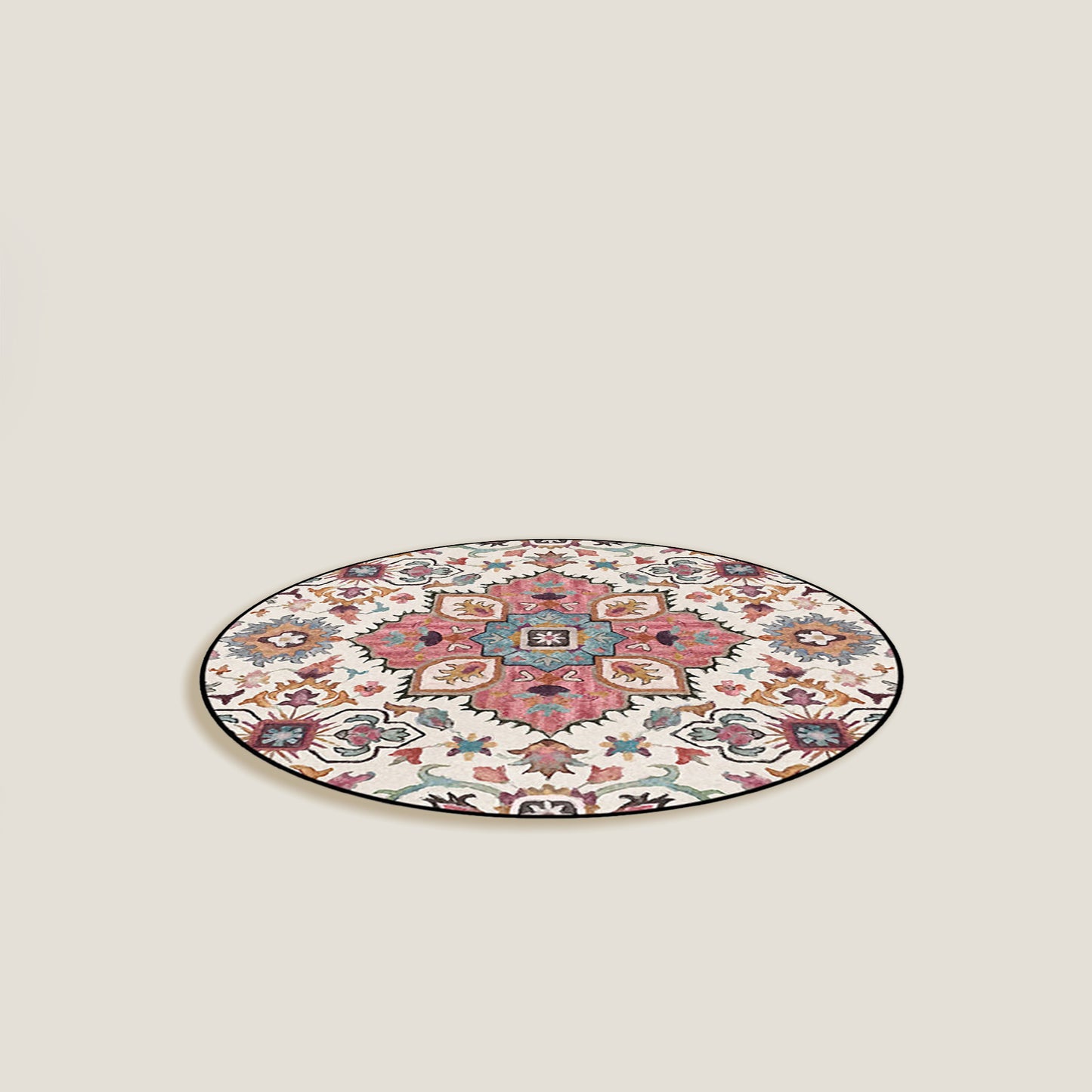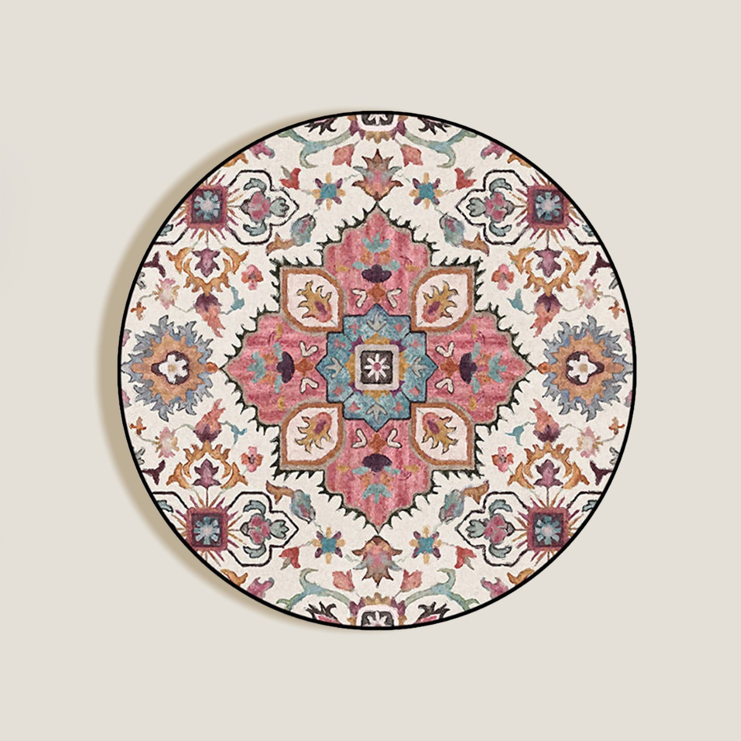 Der Floral Pink Rug hat eine schöne runde Form mit einem weichen Material und einem rosa Blumenmuster im Mandala-Stil.