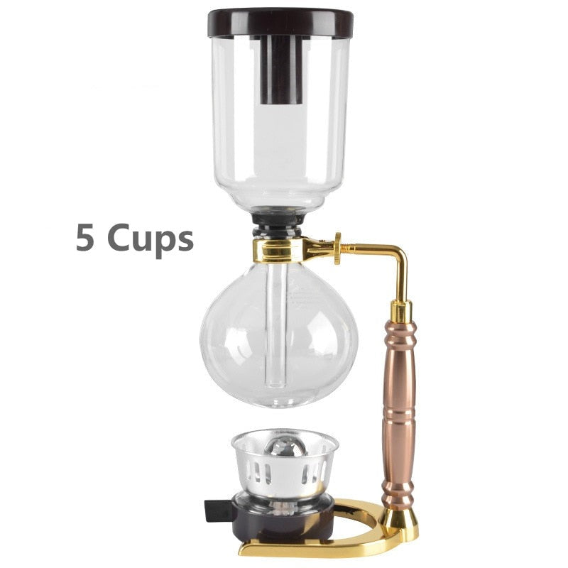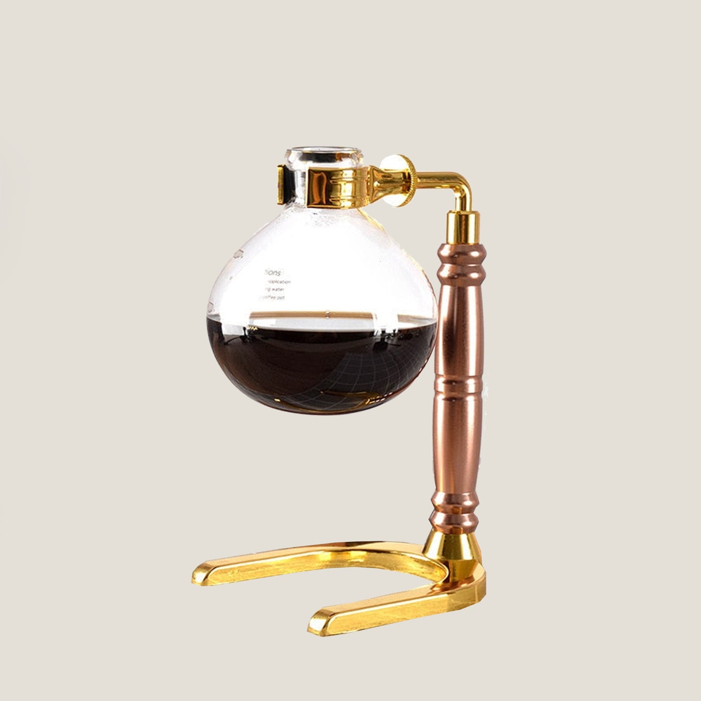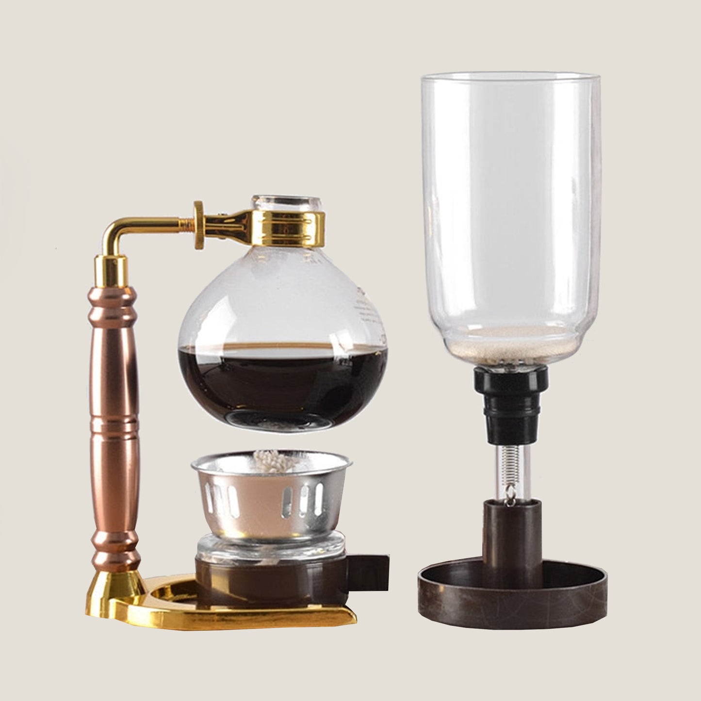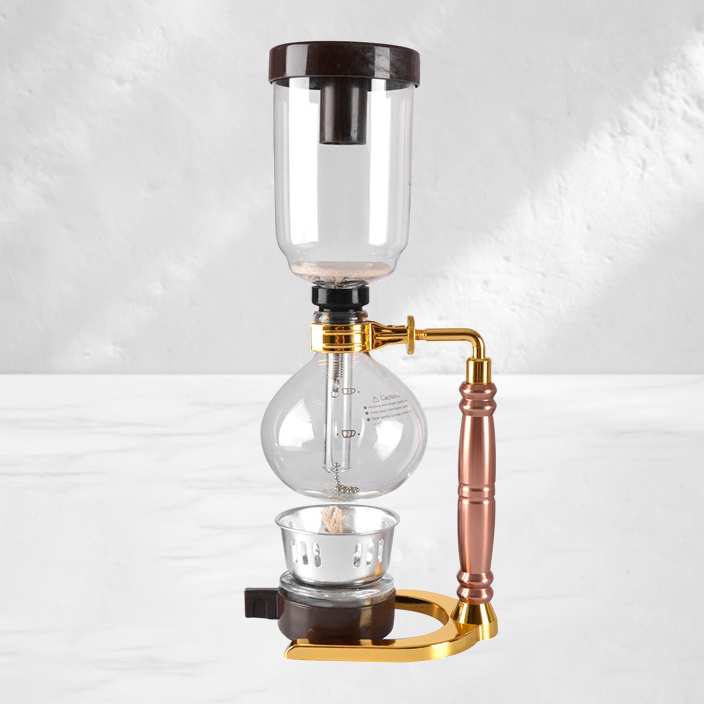Die Glas-Siphon-Kaffeemaschine hat ein einzigartiges Design, um Kaffee manuell zuzubereiten.