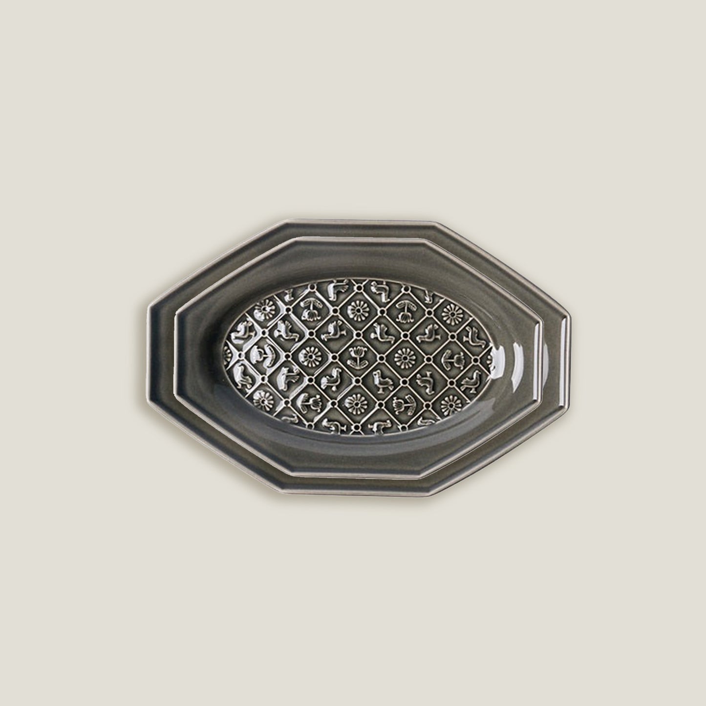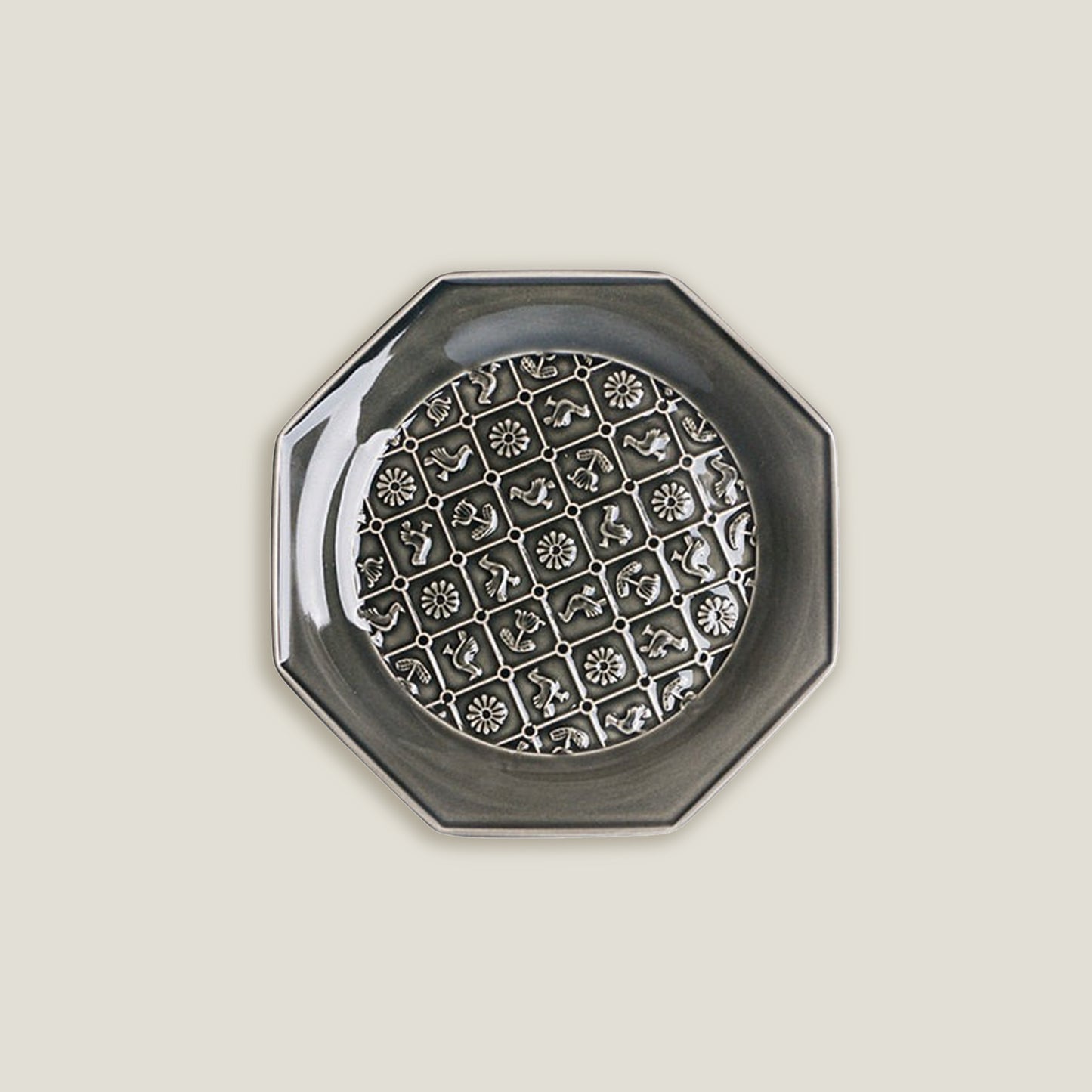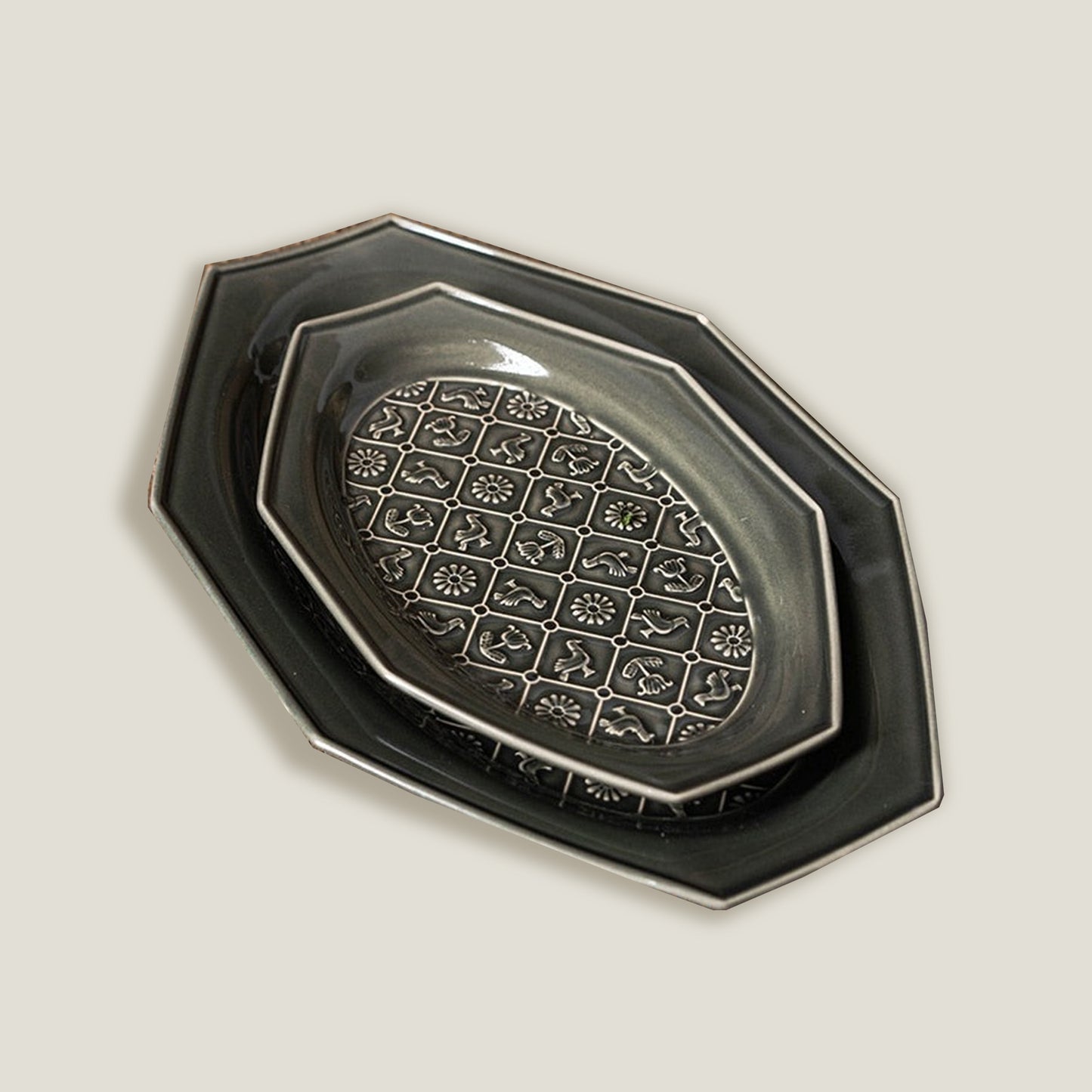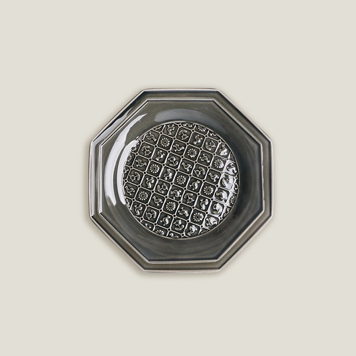 Die grauen achteckigen Keramikteller mit Prägung haben ein schönes Design und sind ein Favorit aus unserem Geschäft.