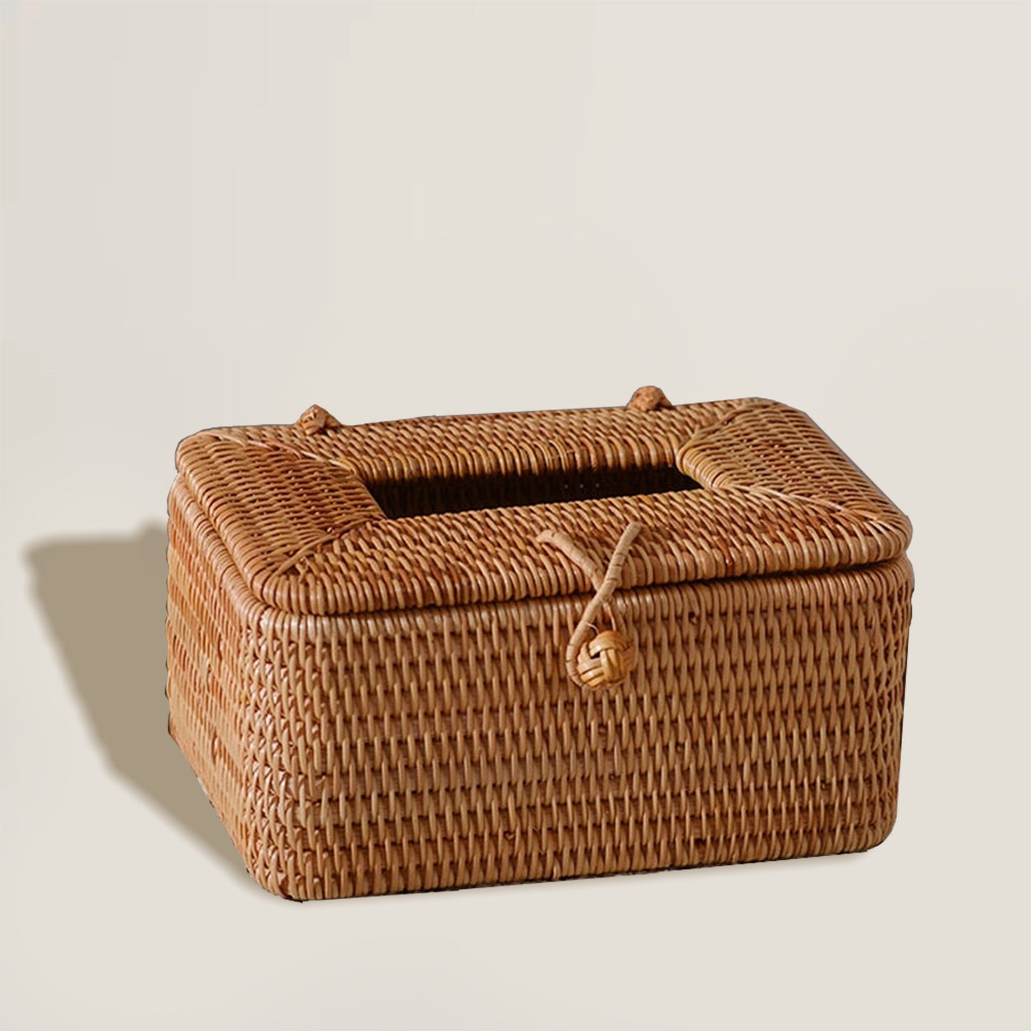 Esta caja porta pañuelos de ratán está hecha a mano con elementos y diseño naturales.