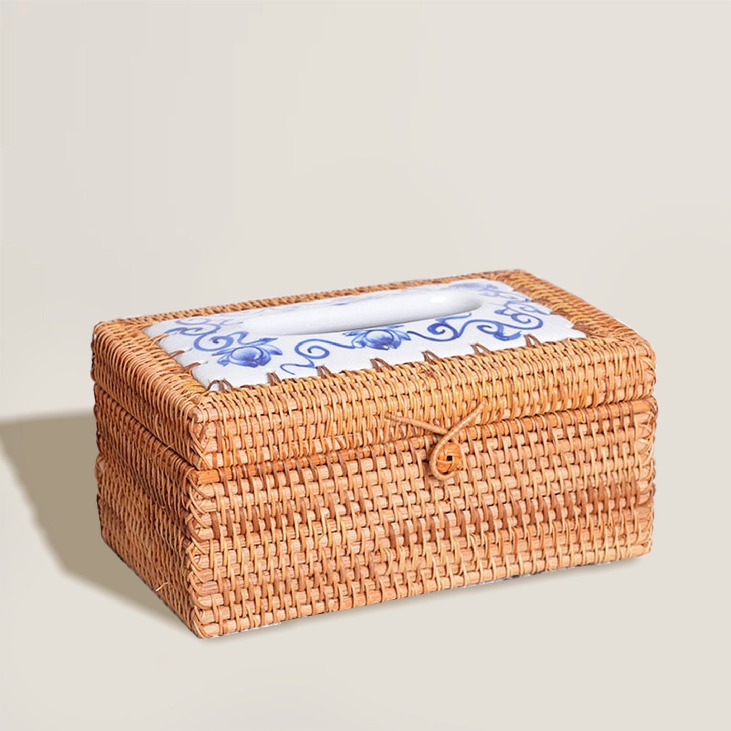 Esta caja porta pañuelos de ratán está hecha a mano con elementos y diseño naturales.