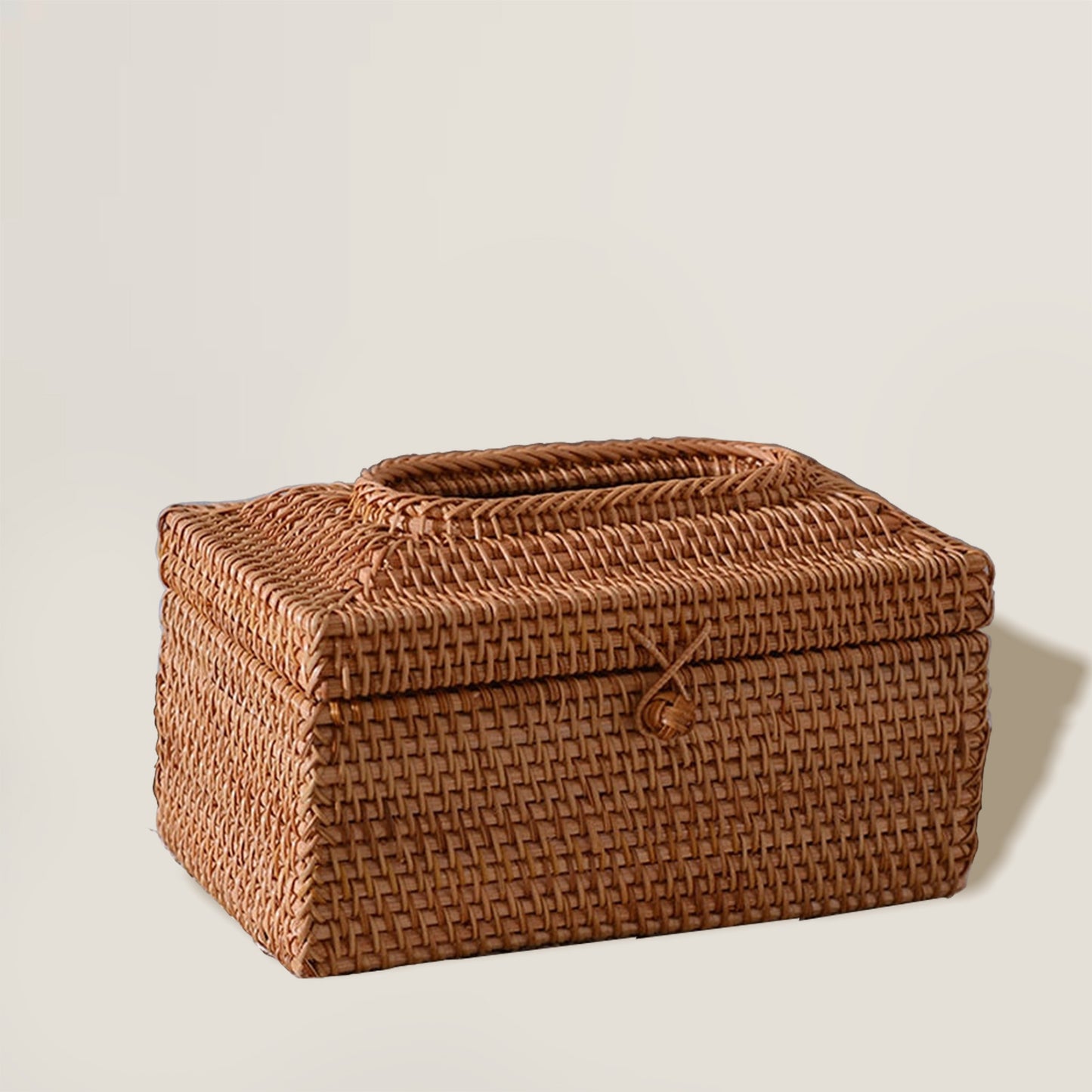 Esta caja porta pañuelos de ratán está hecha a mano con elementos y diseño naturales.