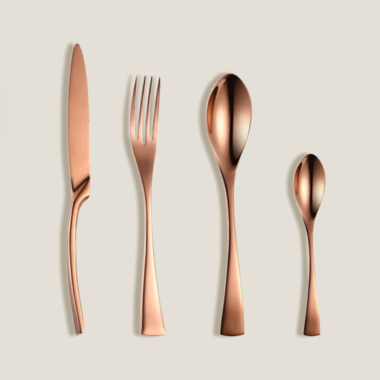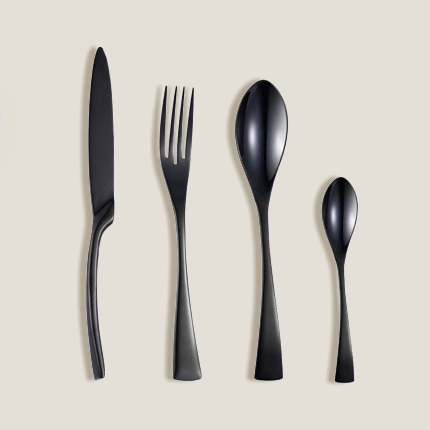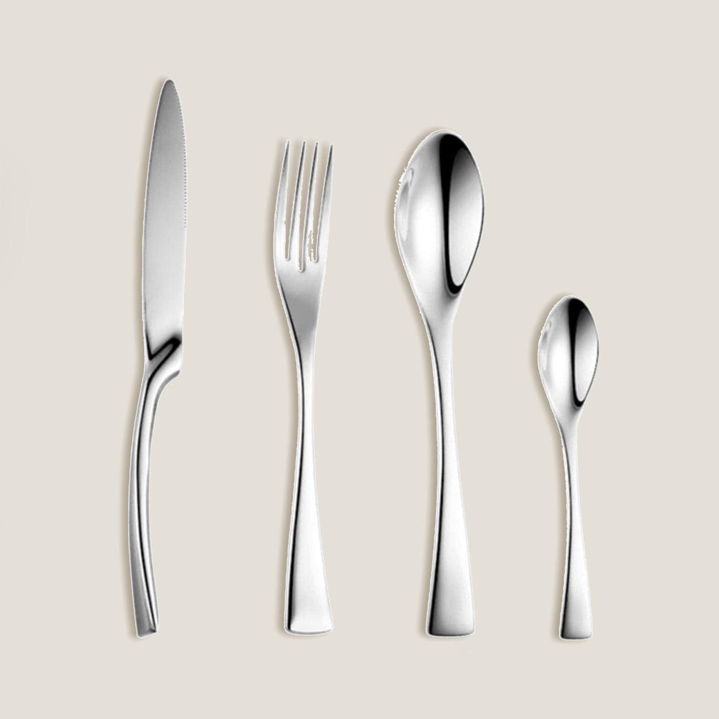 Det moderne bestikksettet inneholder 24 deler for 6 personer. Dette vakre serviset med sine sterke linjer og glatte speilfinish er en av våre favoritter for sitt design.