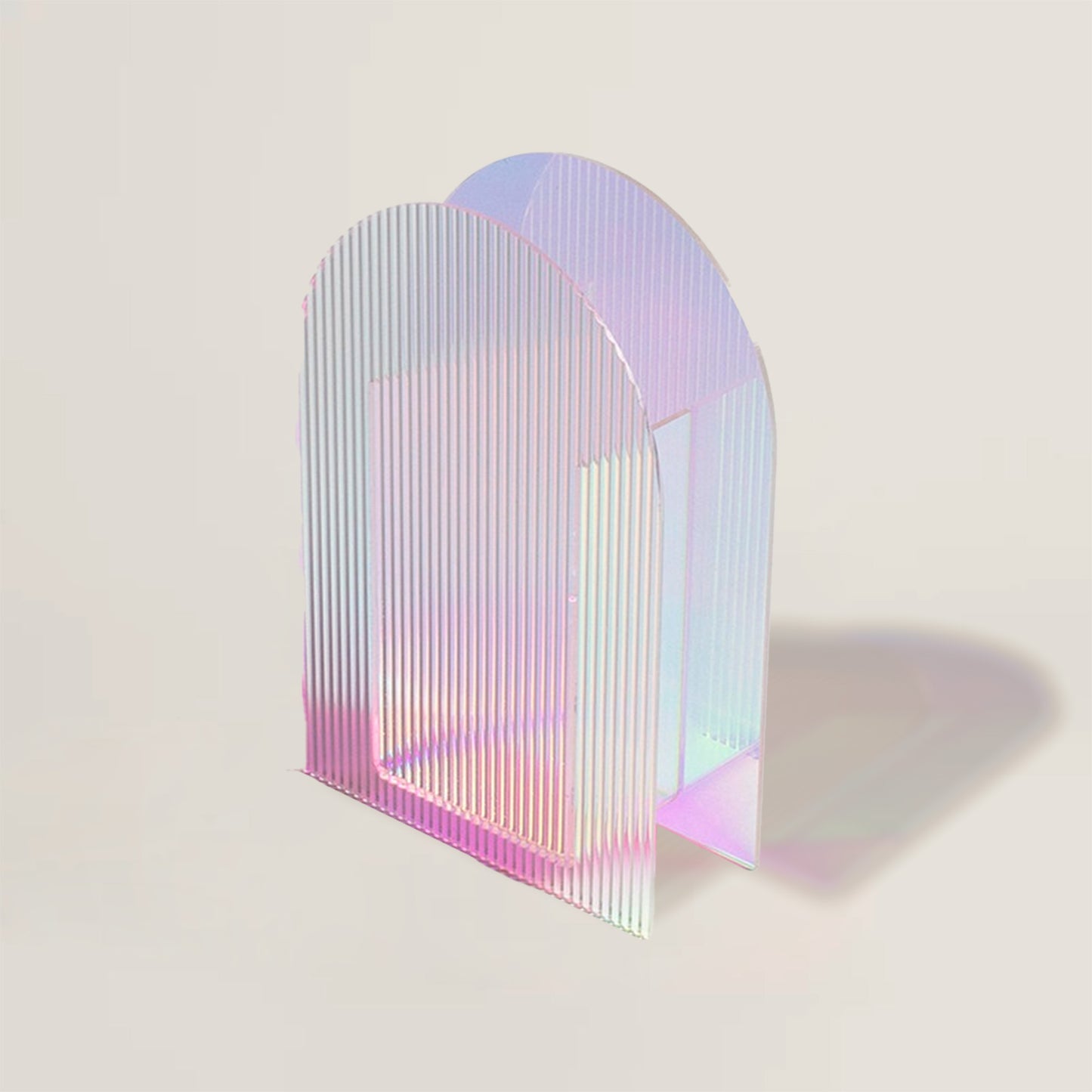 Den lyse holografiske regnbuefargen på den nesten gjennomsiktige akrylen endres i henhold til omgivelsene. Regnbuevasen i akryl er tilgjengelig i to former eller stiler: Circle og Arch.