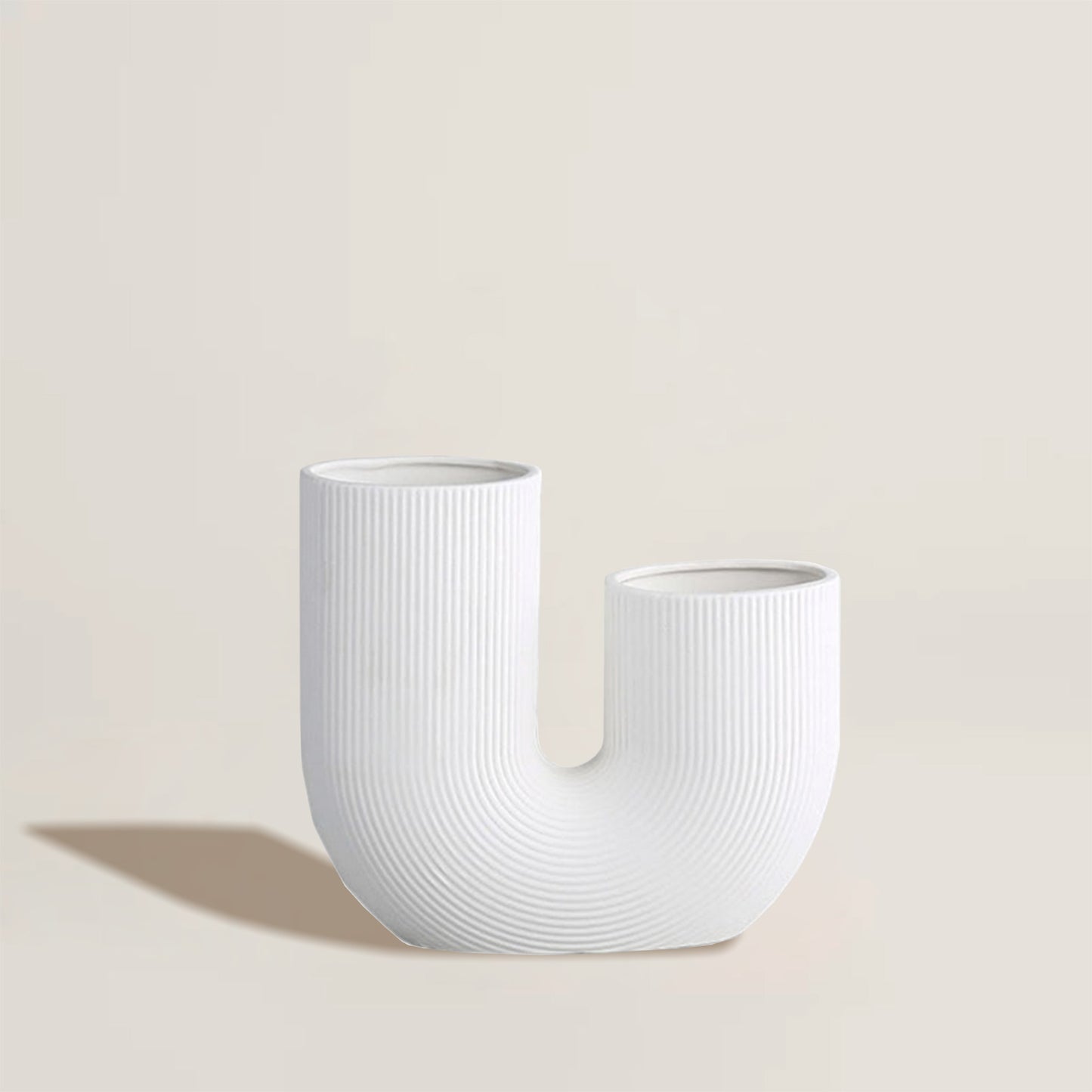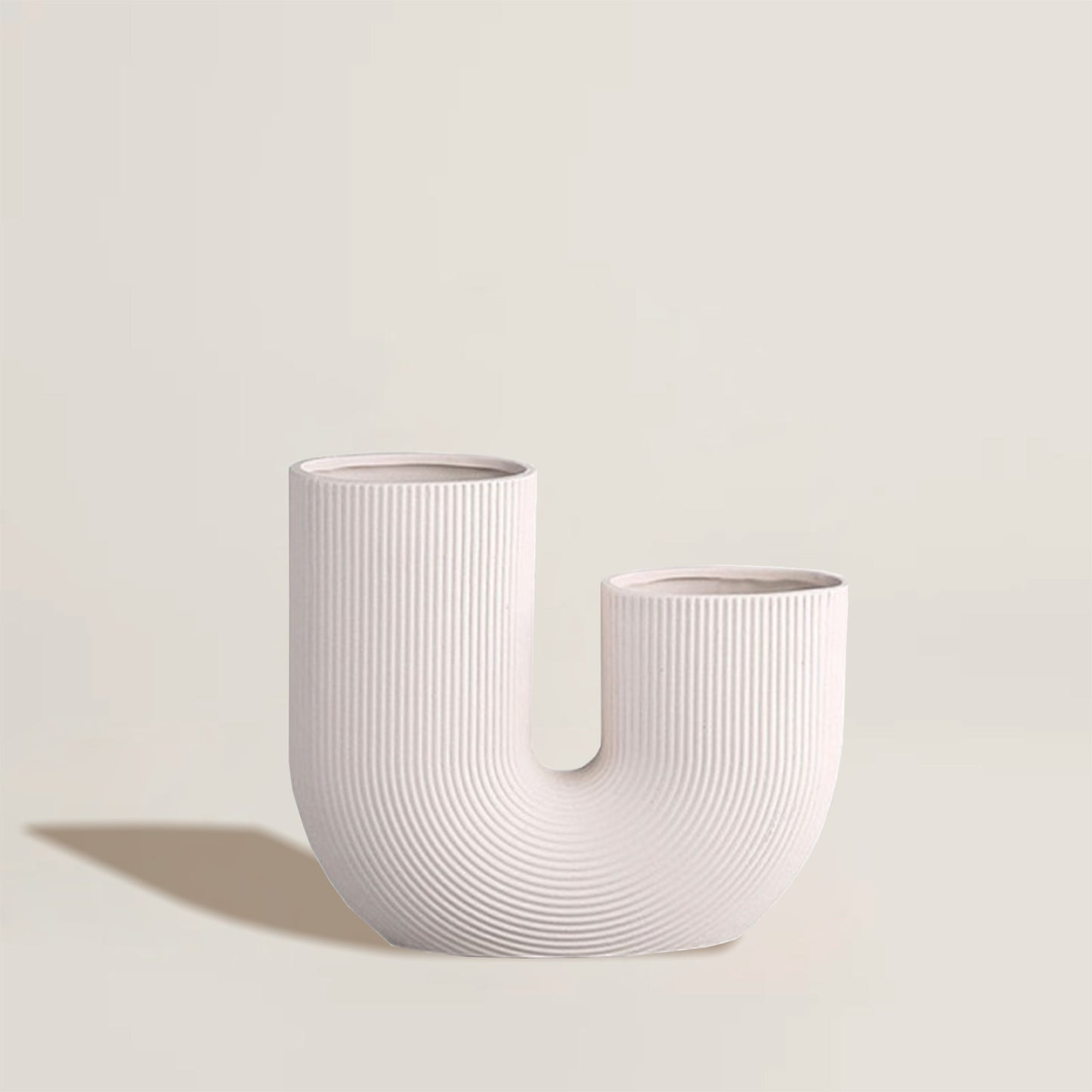 U-rundvasen har en halvformet keramisk tekstur med et stripemønster.