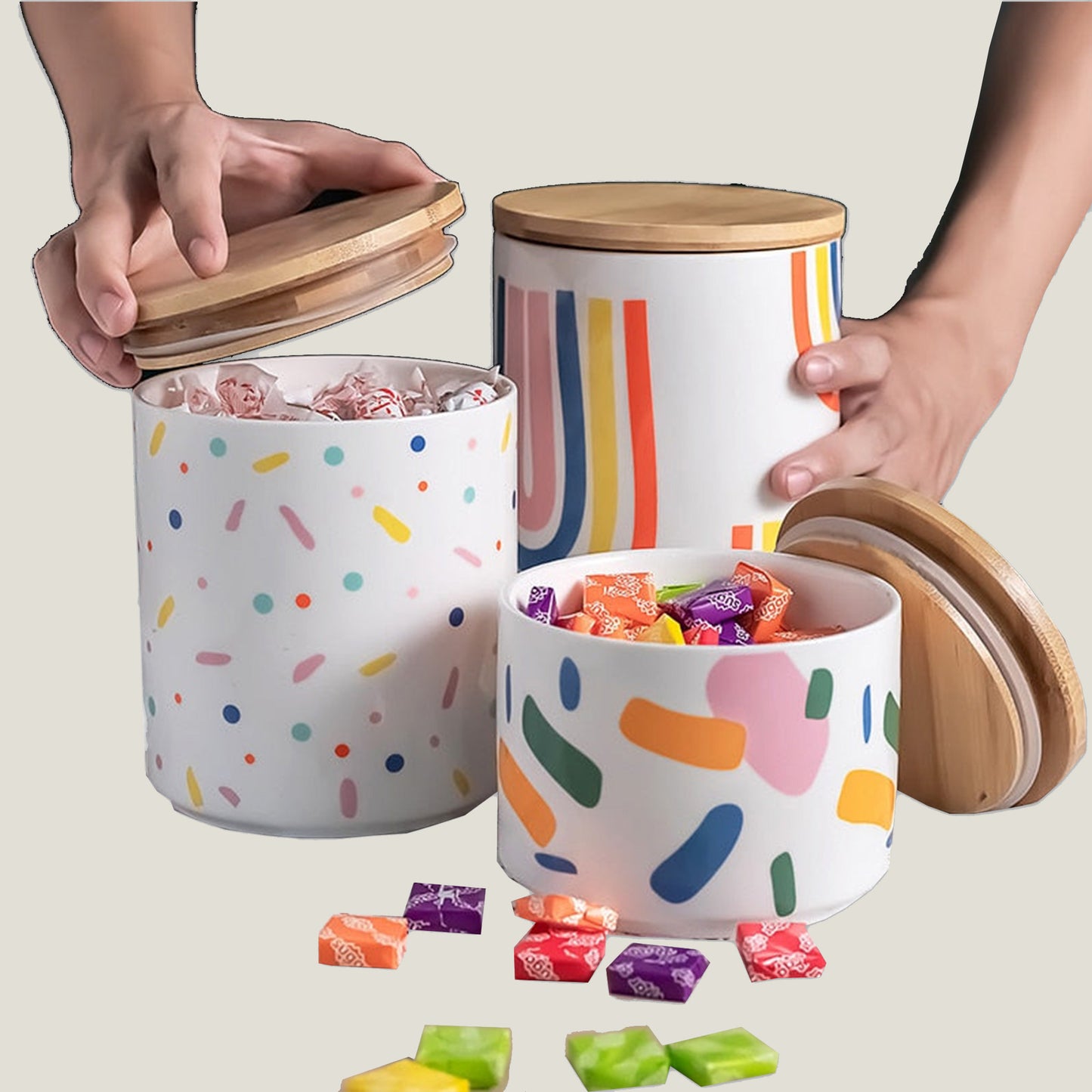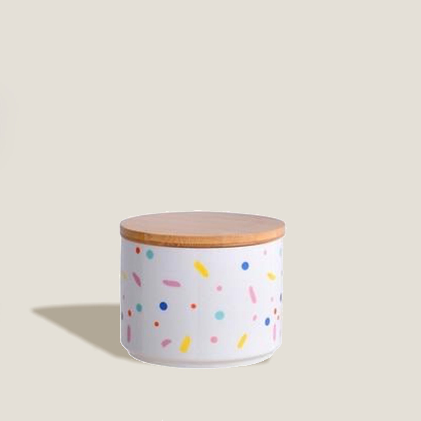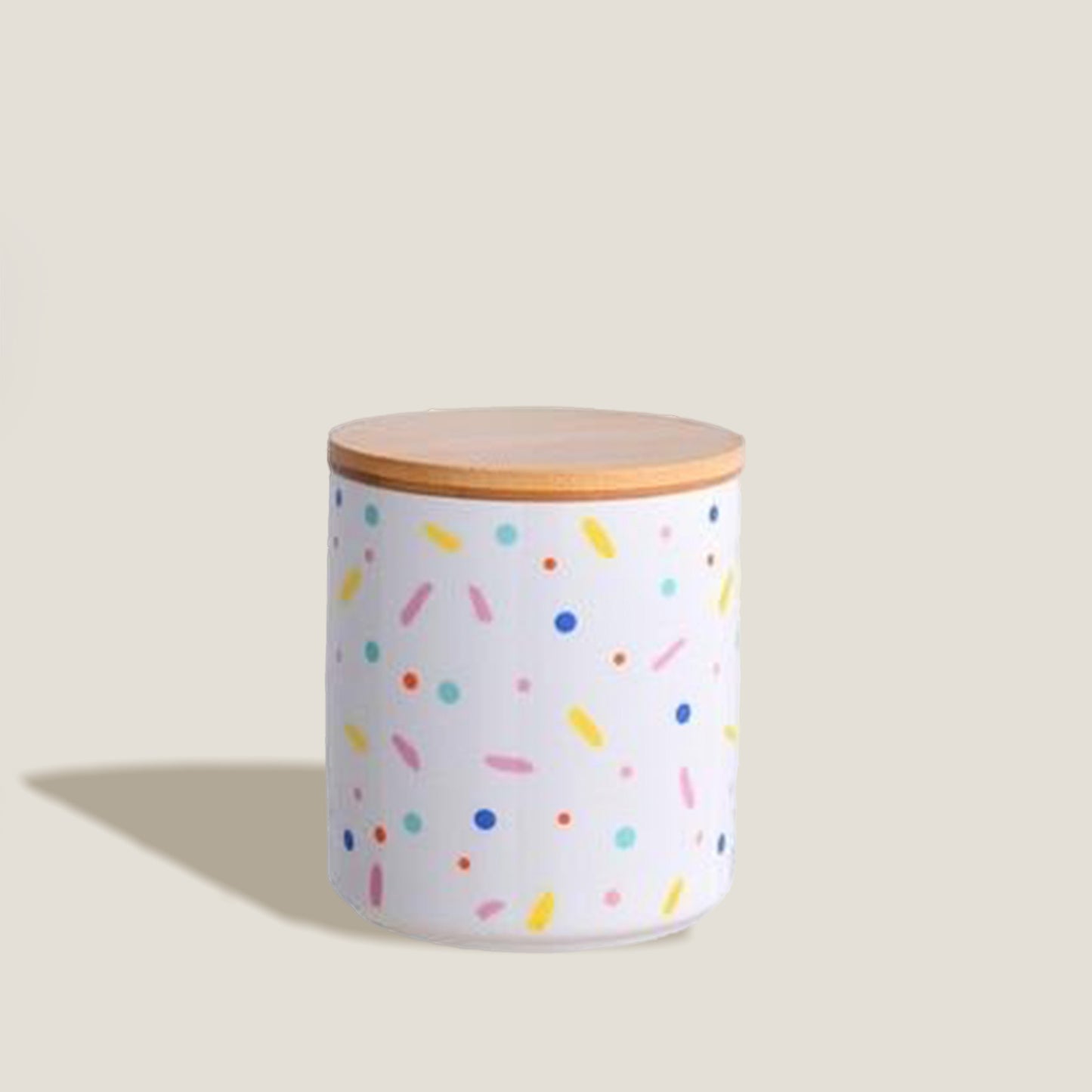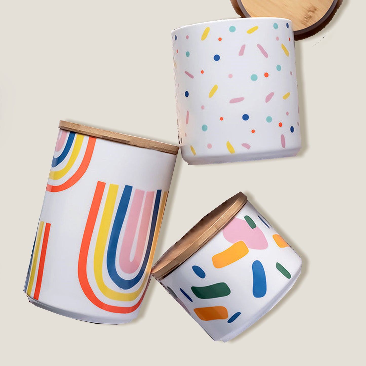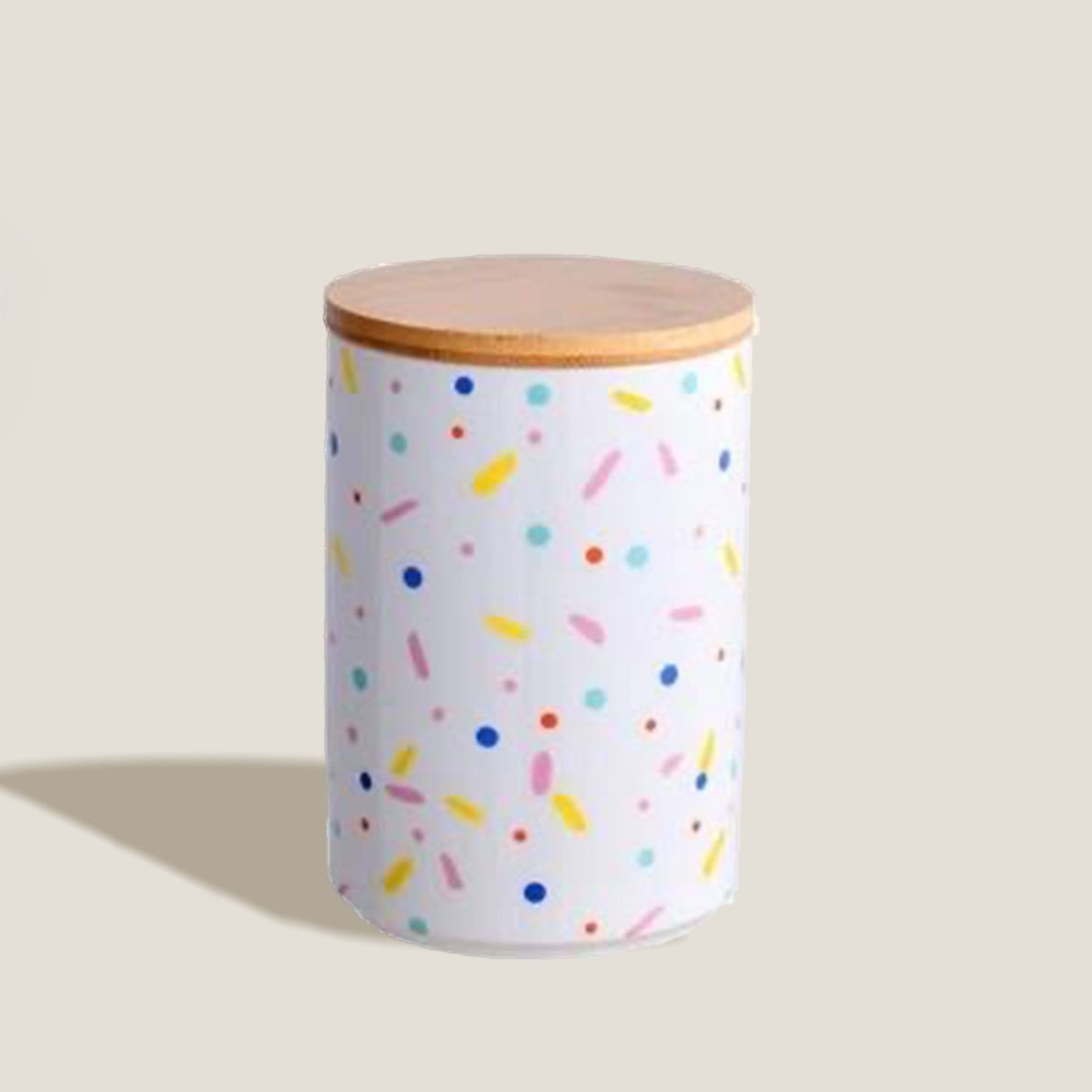 Confetti Rainbow Keramikkkrukker har et fargerikt, morsomt design med et trelokk for å beskytte det du oppbevarer inni. Ideell for å organisere krydder i pantryet ditt.