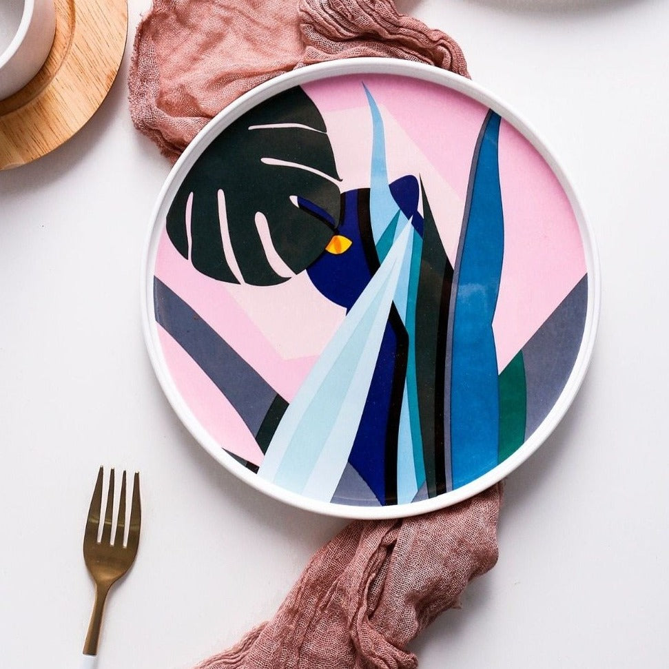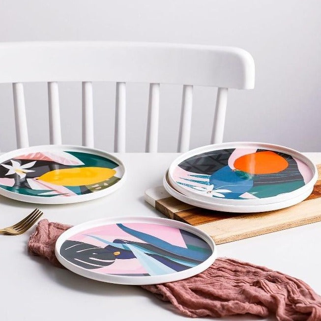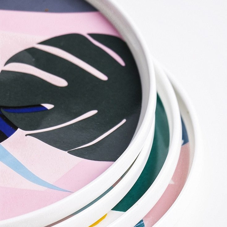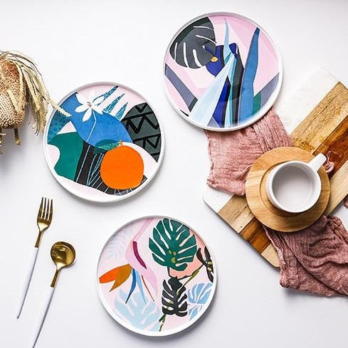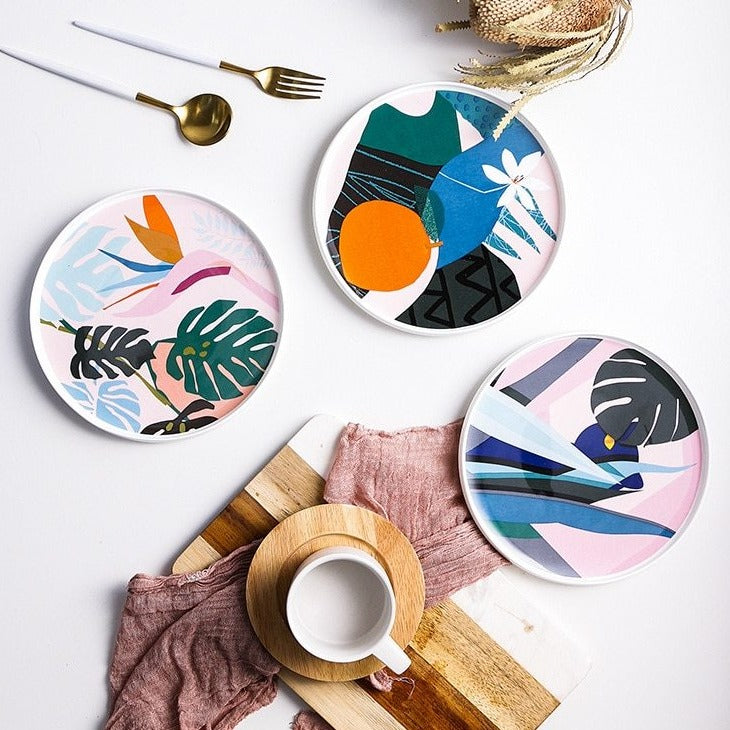 De tropiske rosa tallerkenene har et nydelig, unikt kunstmønster inspirert av tropisk skog. Dette vakre serviset er et abstrakt dekorasjonsstykke.