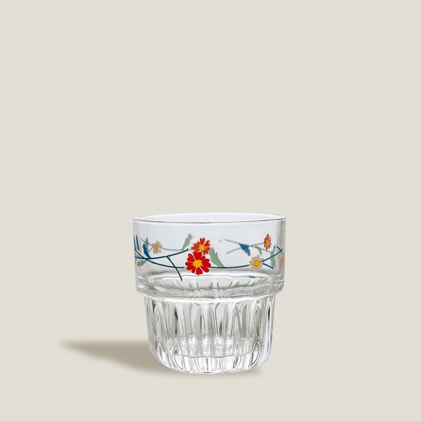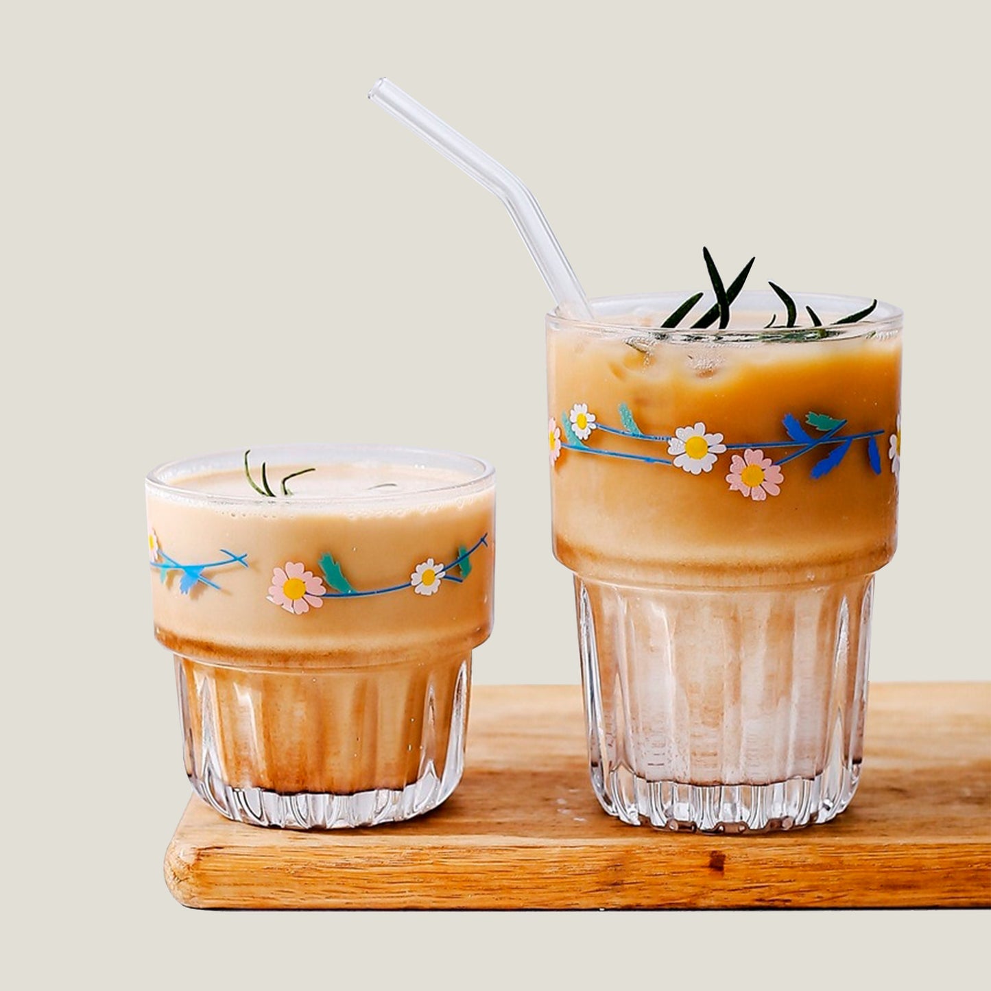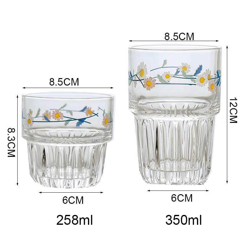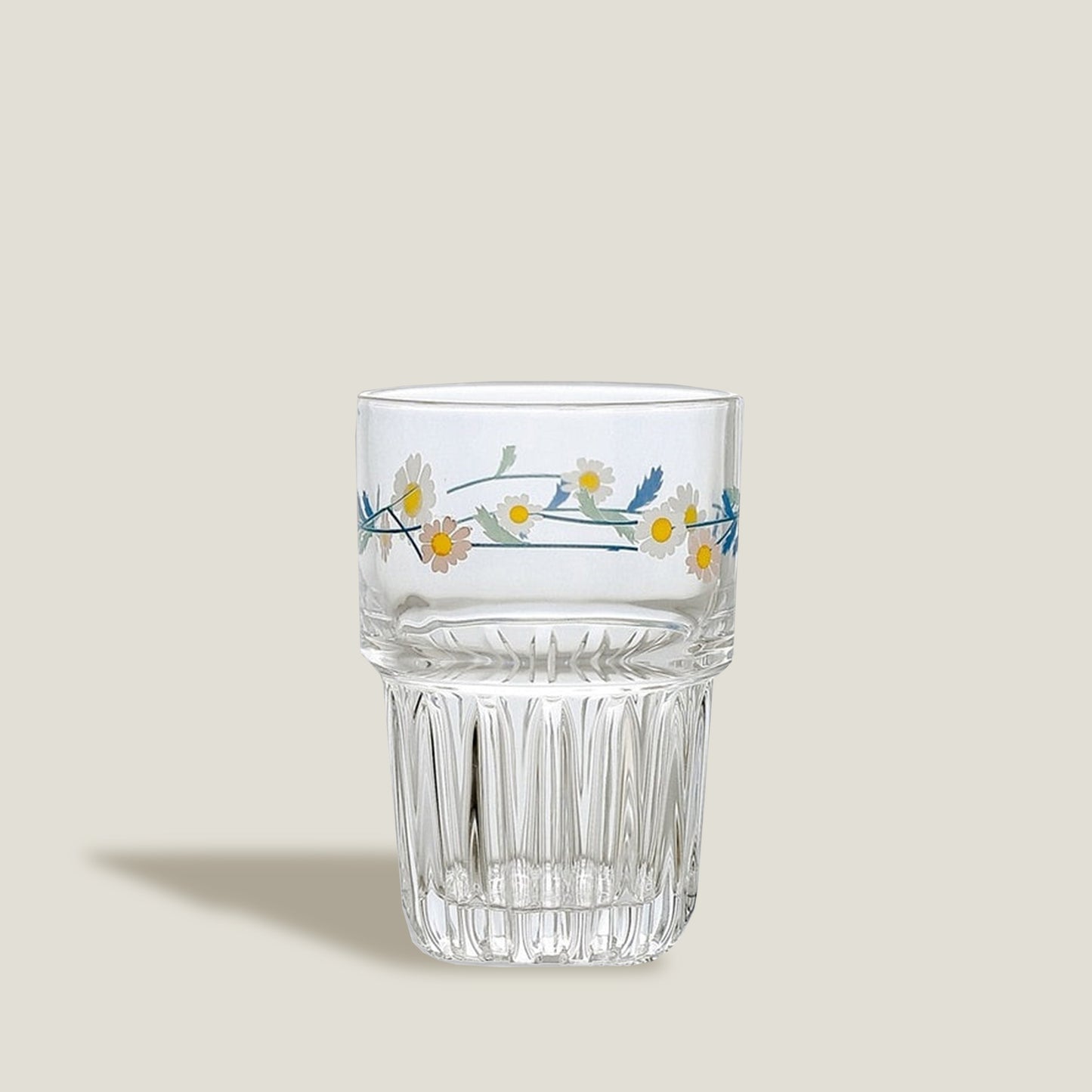 Blomstertusenfryd-glasset har et vakkert glassdesign med en gjennomsiktig farge og små trykte tusenfryd.