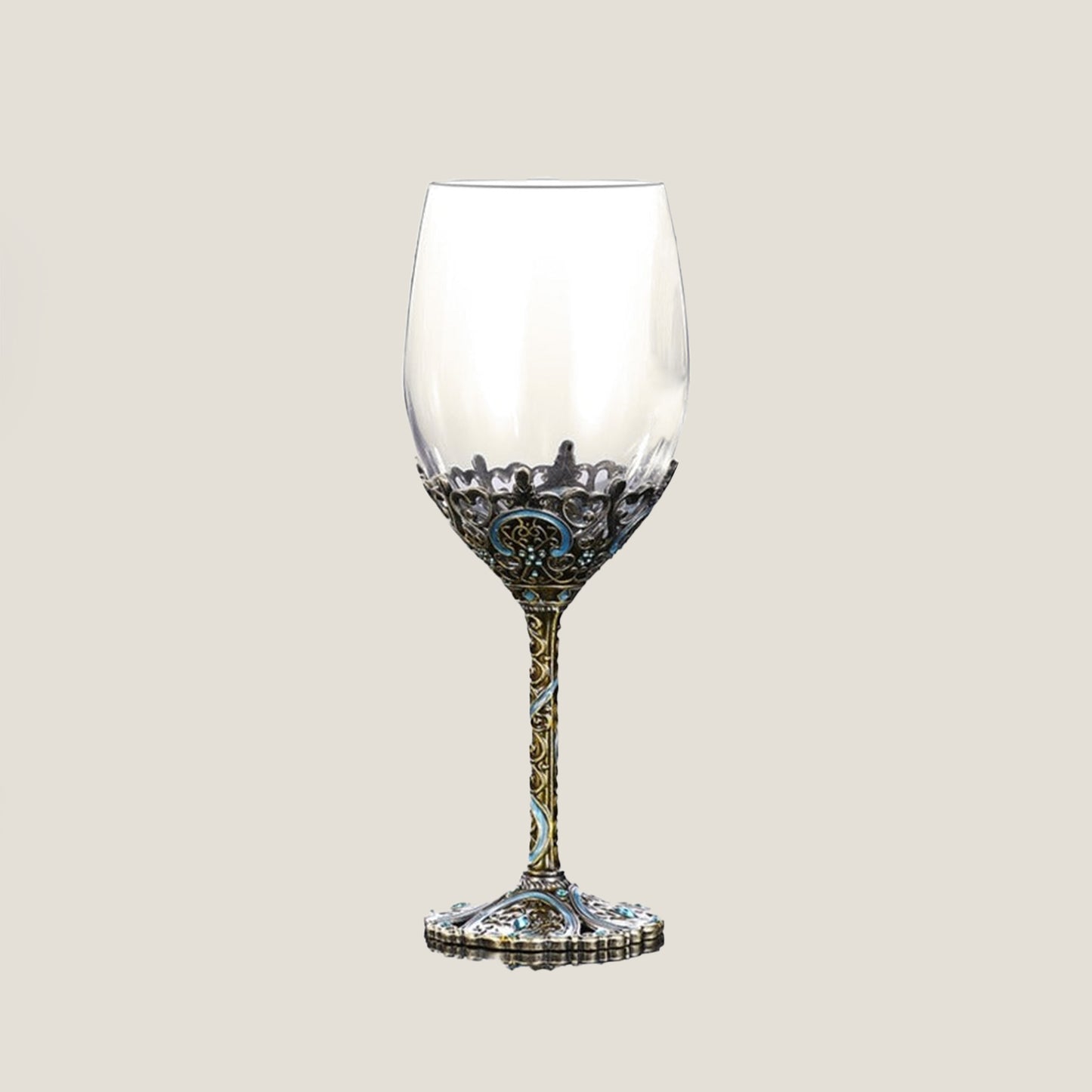 Blue Metal Wine Glass har et vakkert gravert håndtak design med en magisk skoginspirasjon i tankene, og blå detaljer.