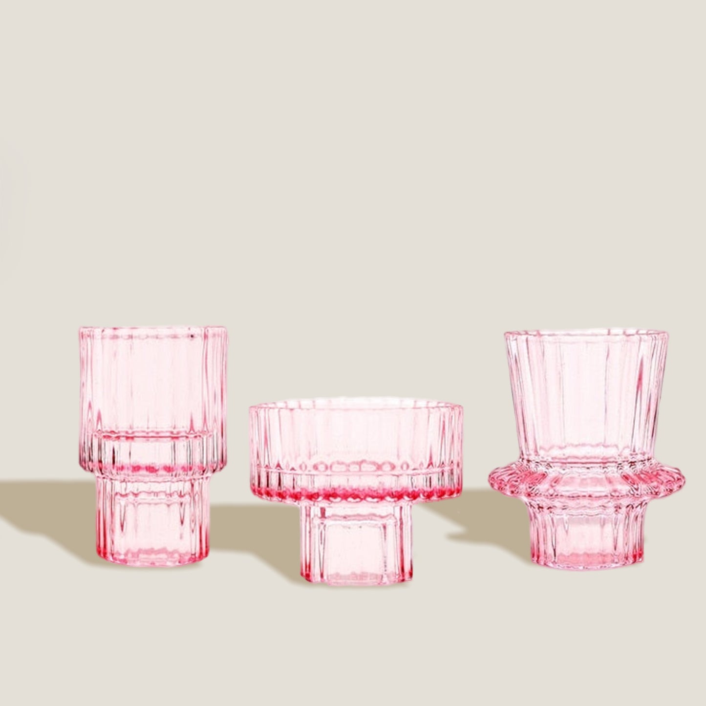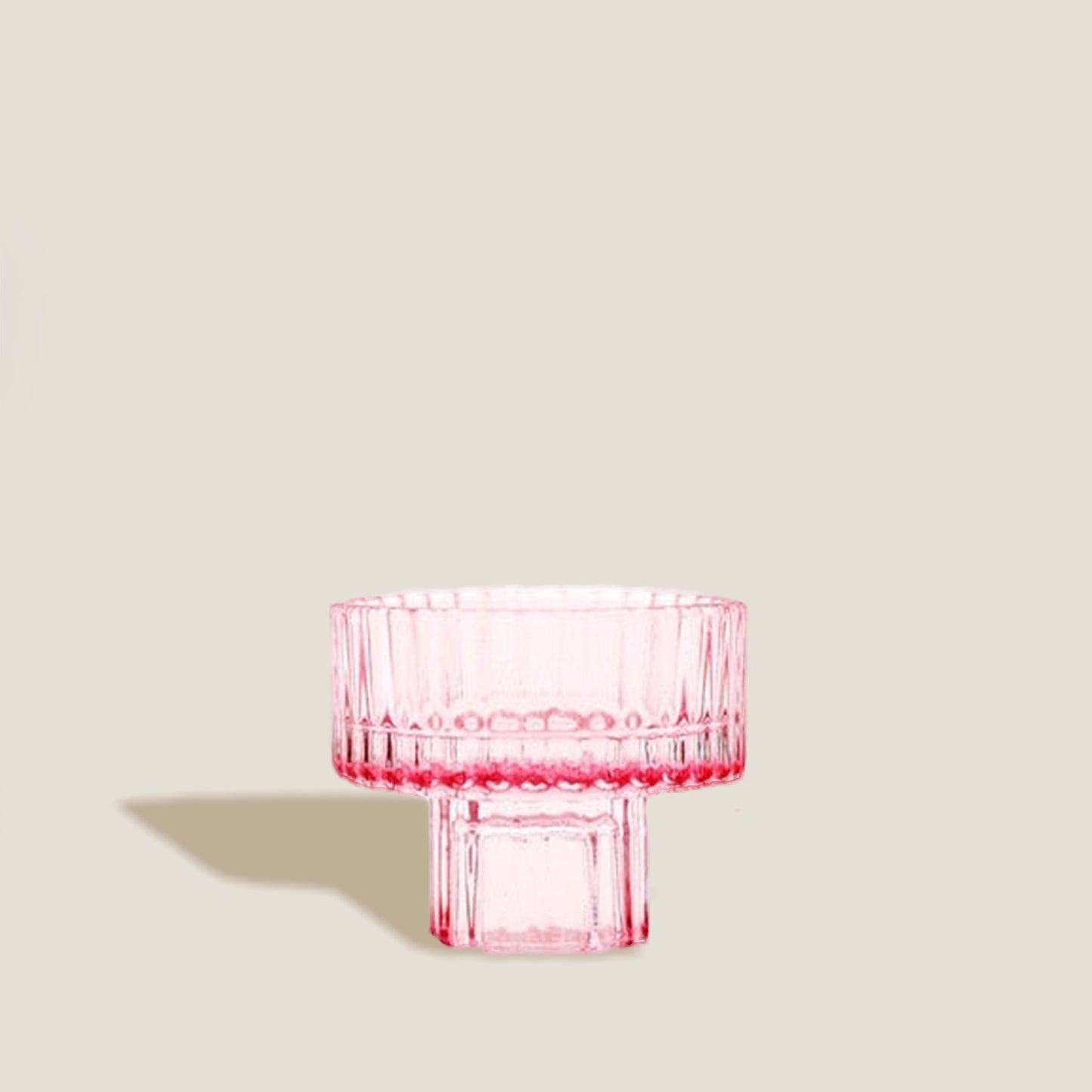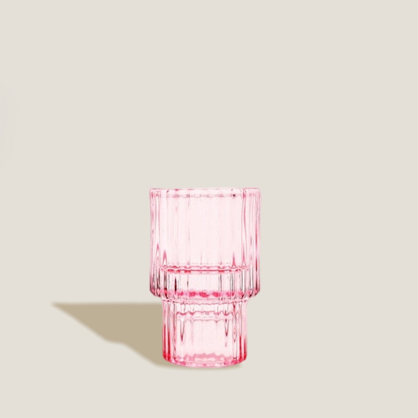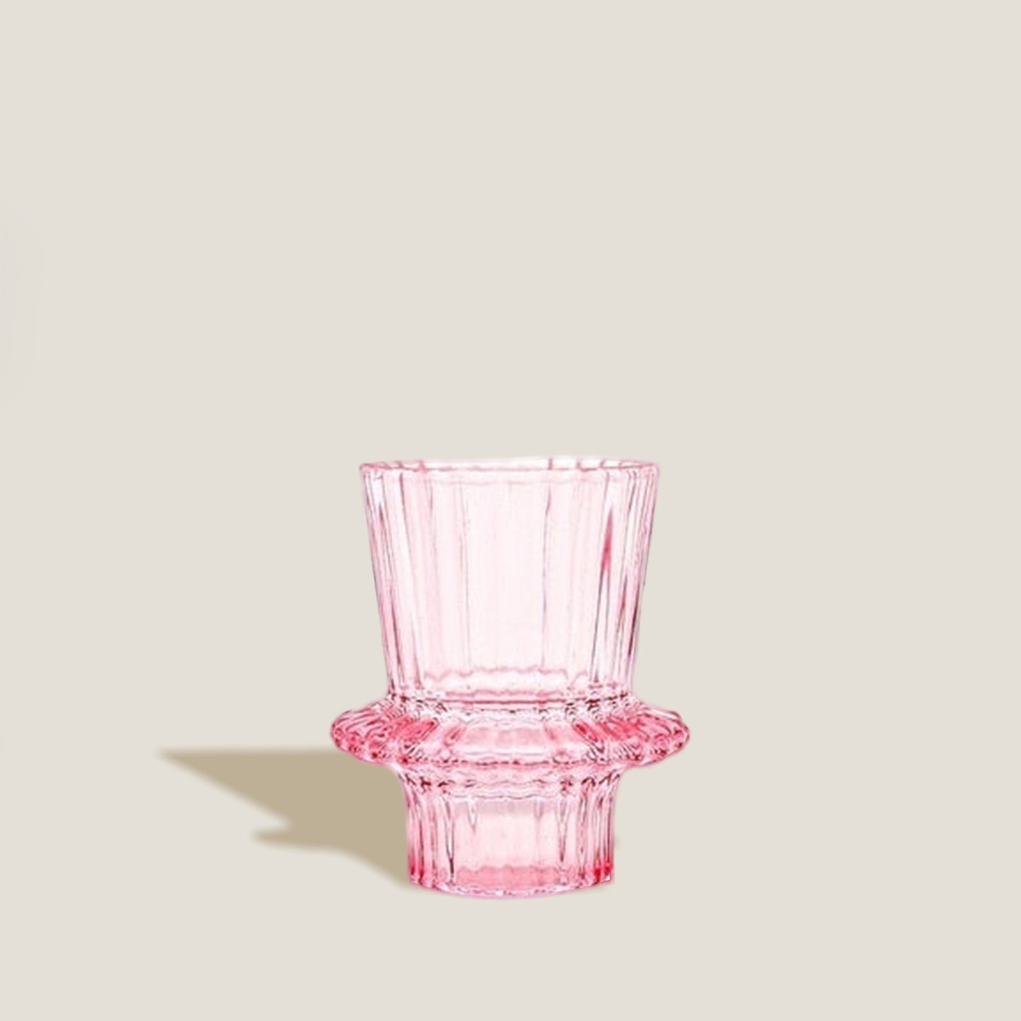 Pink Stripe Glass Candle Holder er en favoritt fra butikken vår for sin design og unike form, tilgjengelig for kjøp i en myk fargepall med en ugjennomsiktig finish.