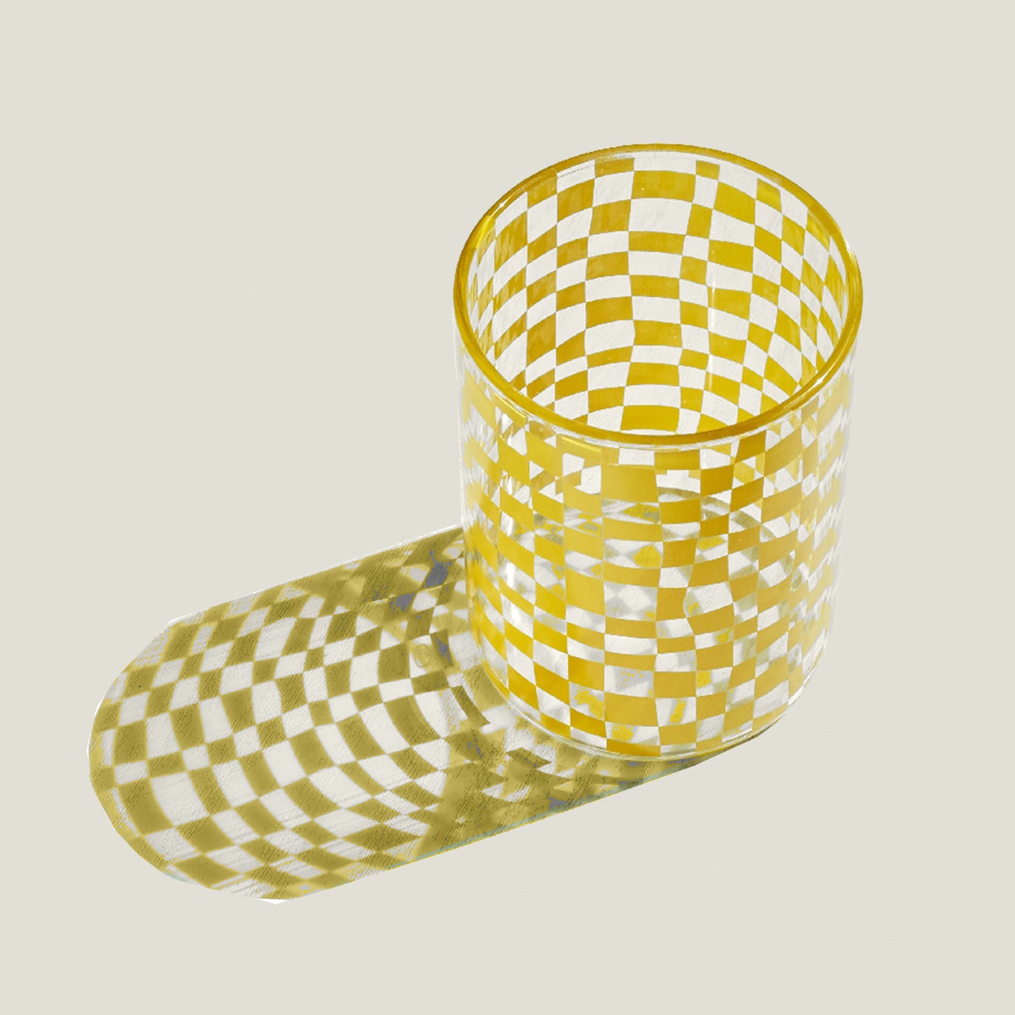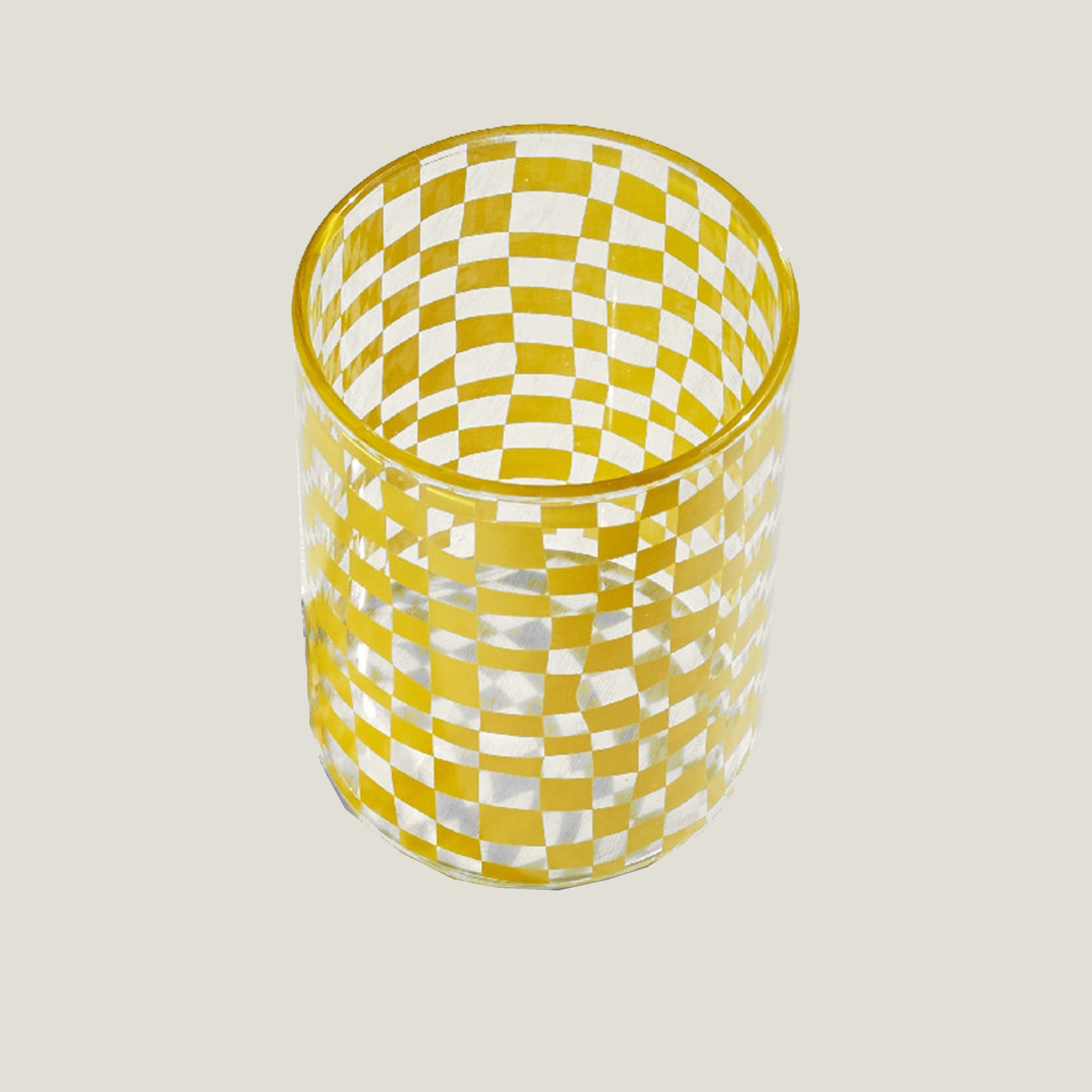 Det rutete glasset har en vakker håndlaget glatt tekstur med et firkantet sjakkbrett fargerikt rutemønster,