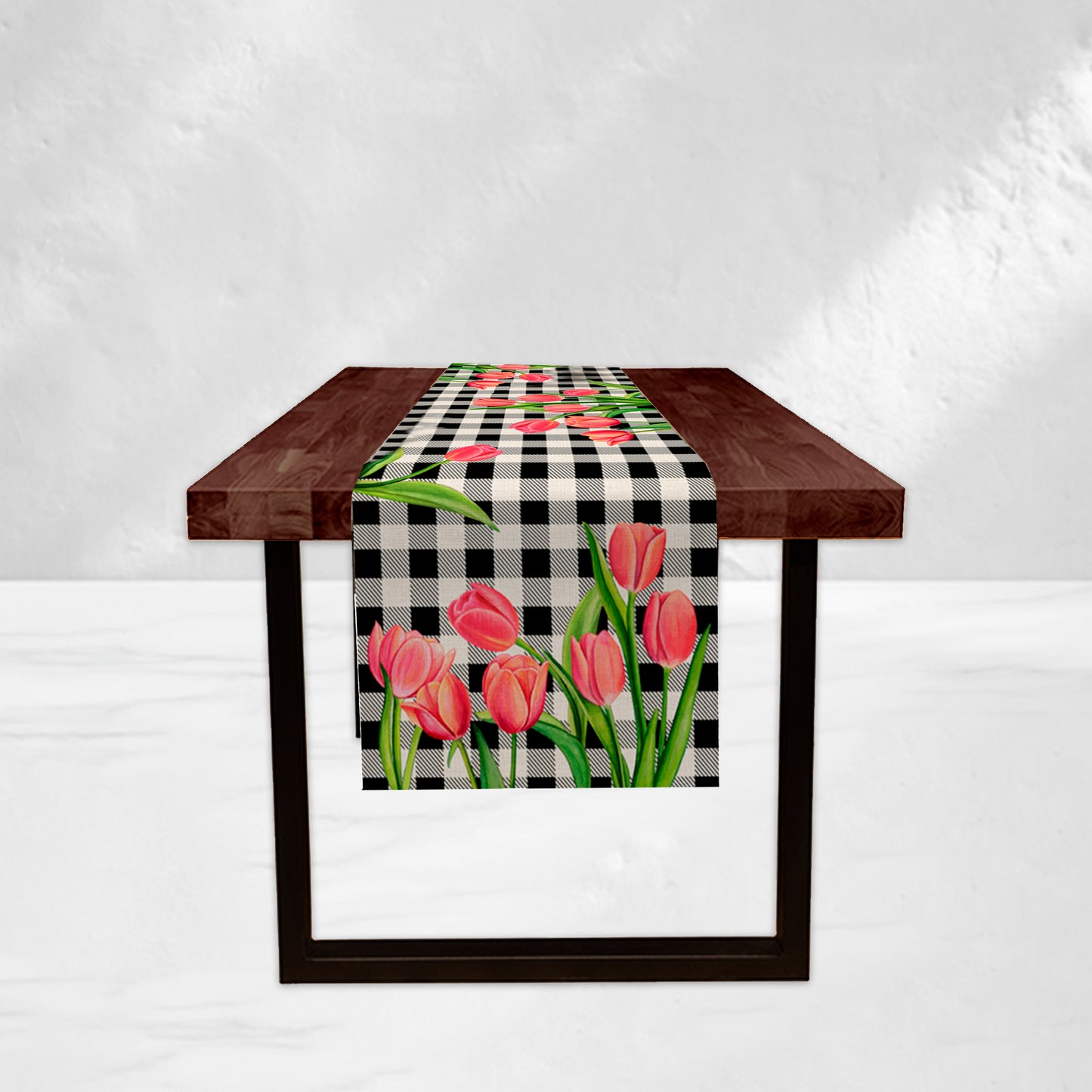 This Black Plaid Tulip Table Runner is a great way to instantly liven up any dining room or kitchen. Crafted from a soft texture and featuring a colorful floral pattern and gingham check black and white pattern, it's sure to bring a unique touch of style that's sure to stand out.