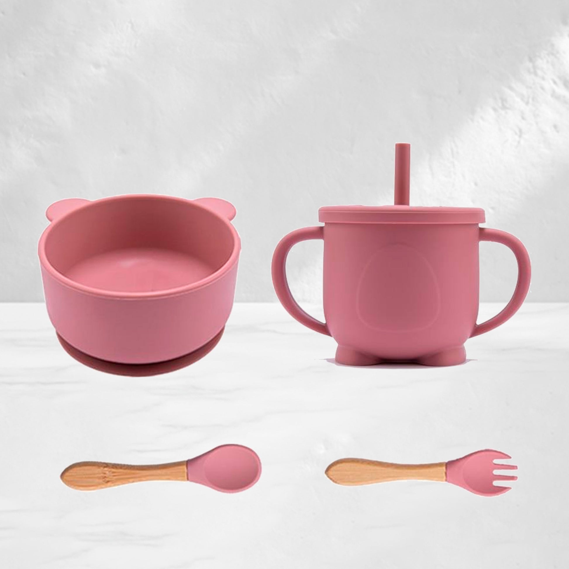 4 Pieces Set Includes 1 Bowl + 1 Cup + 1 Fork - 1 Spoon.