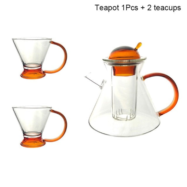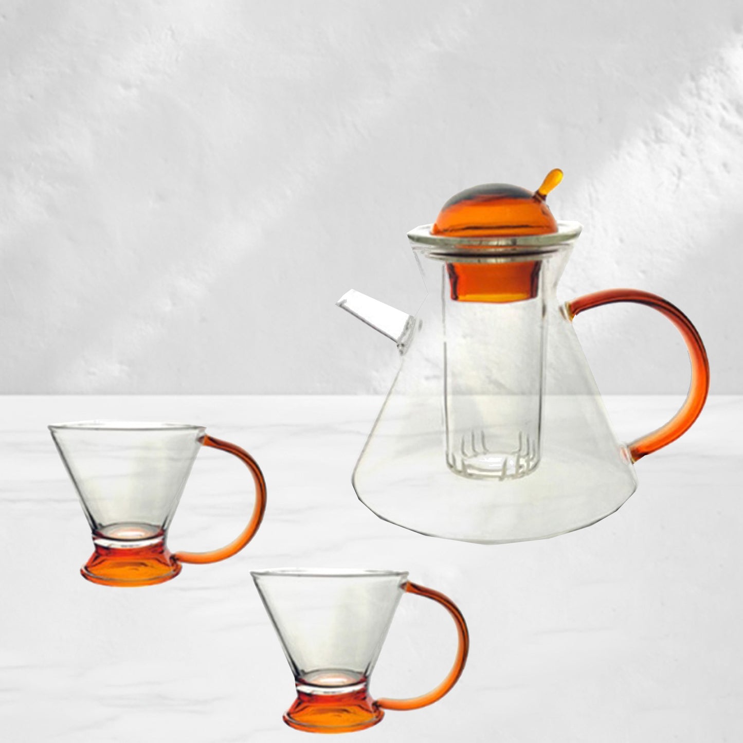 The Glass Maroon Teapot Set has a beautiful and unique design with a big handle.