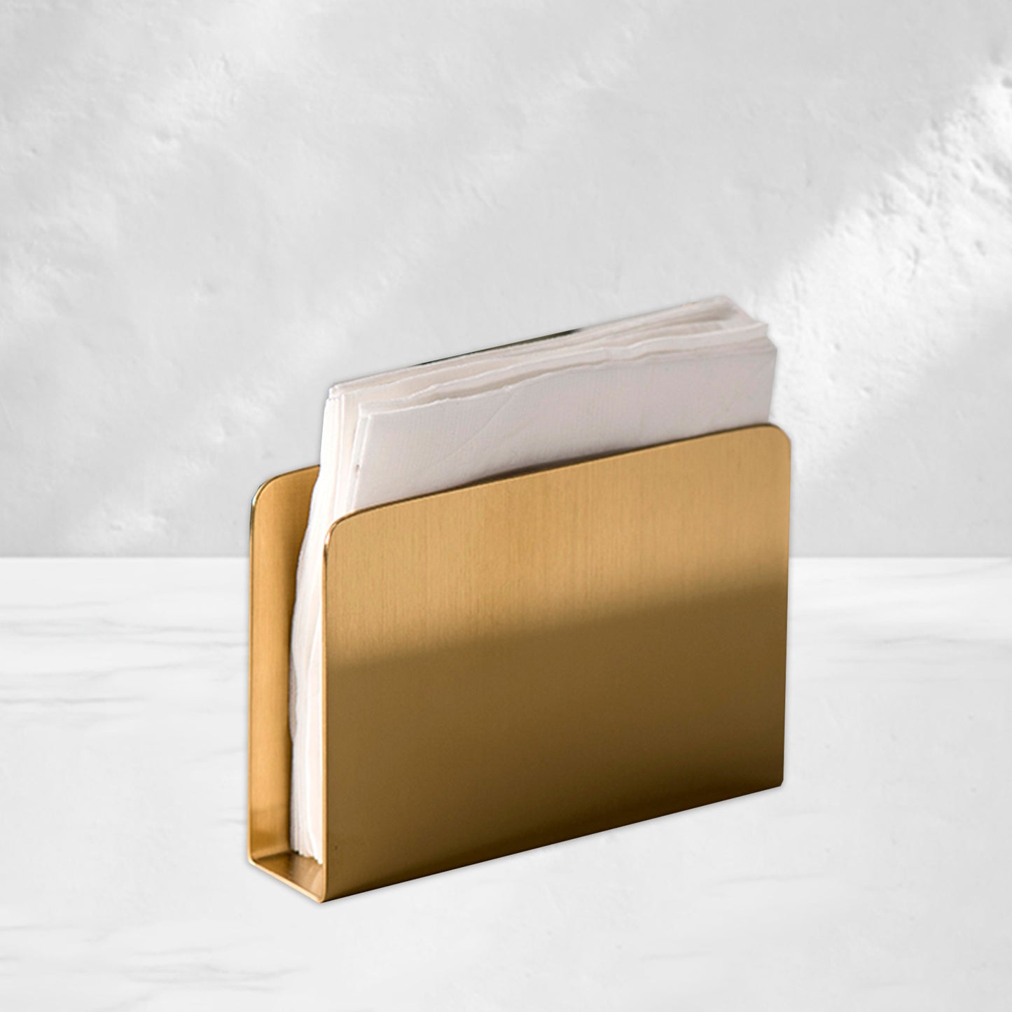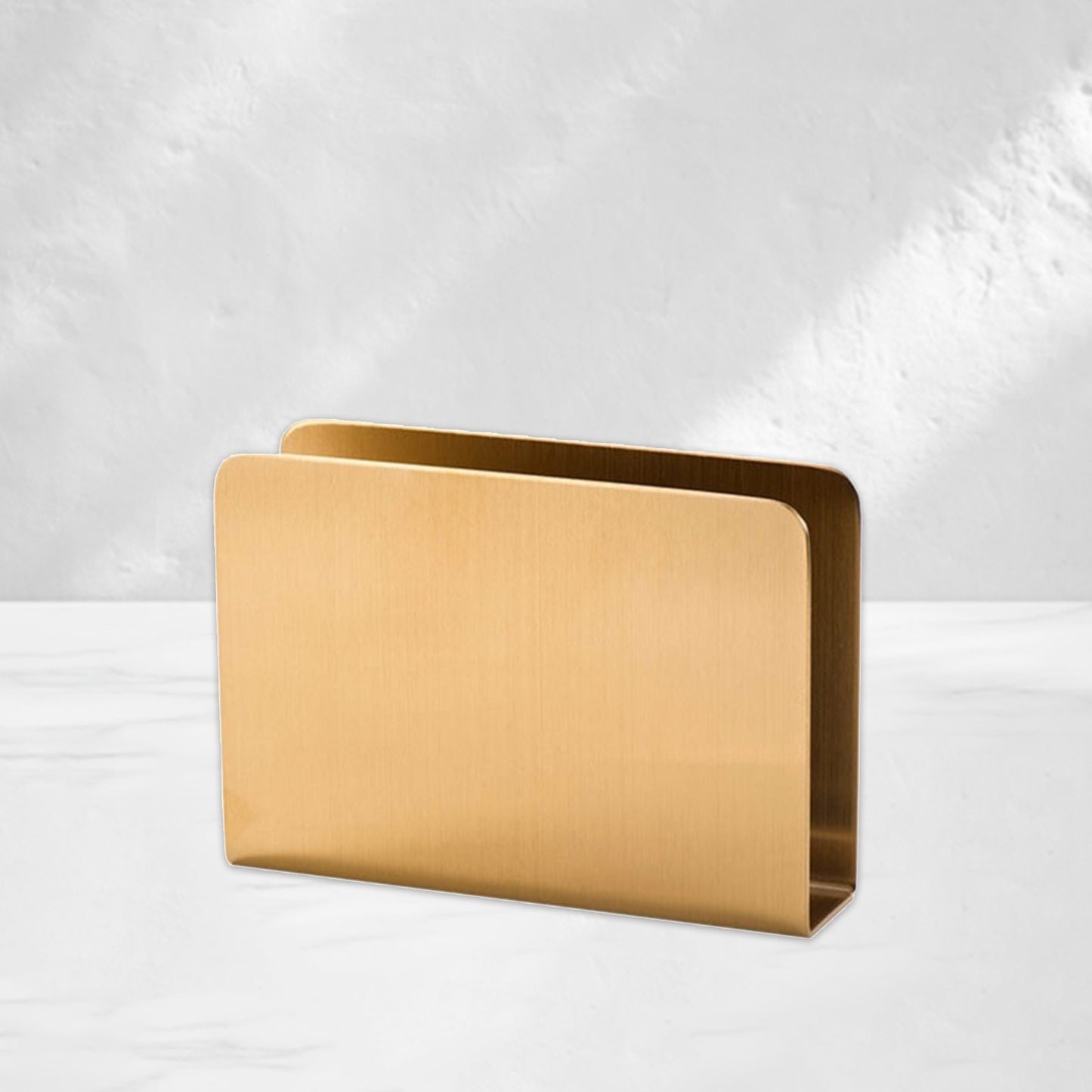 The Gold Rectangle Napkin Holder has a minimalistic style design with metal and a gold finish. This piece is versatile for styling your dining room table.
