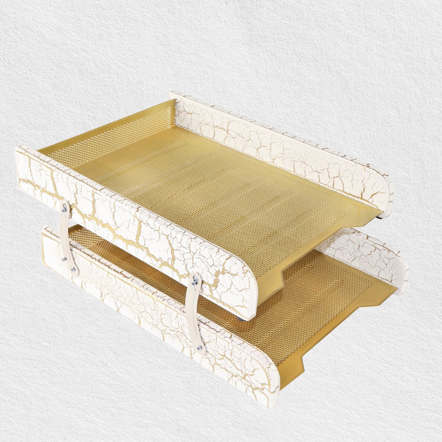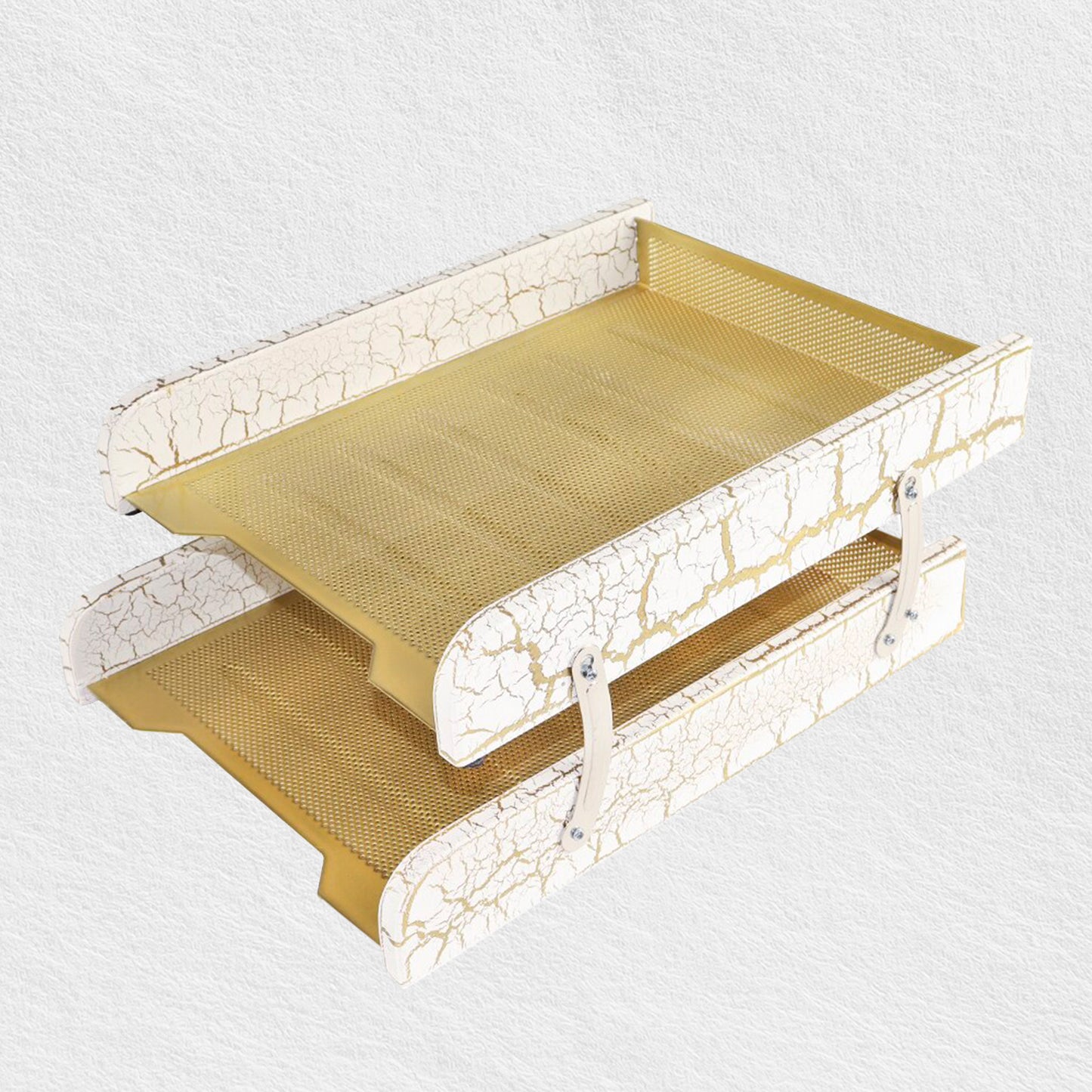 The Gold Stone Tray Set has a beautiful white with gold cracked texture, the set includes 2 trays that can be stacked for a double layer. Ideal for office organization.
