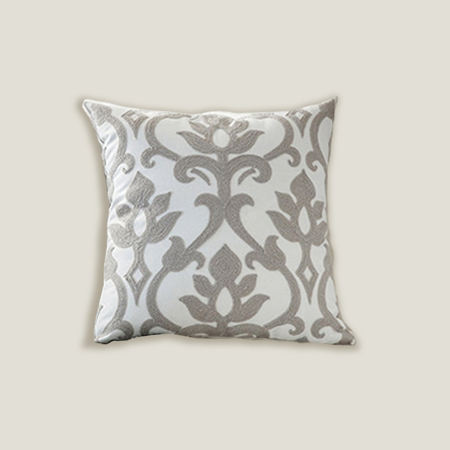 As capas de almofada bordadas têm uma textura suave e macia com um padrão geométrico bordado em cinza acinzentado.