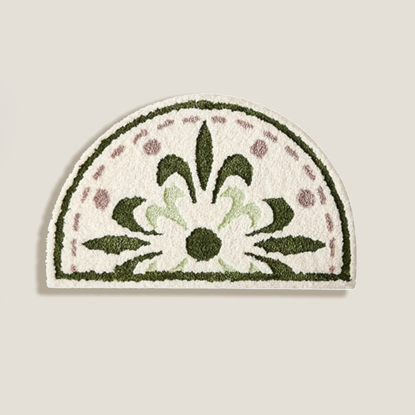 O tapete floral tem um lindo formato de semicírculo com uma textura macia e fofa e um padrão de flores.