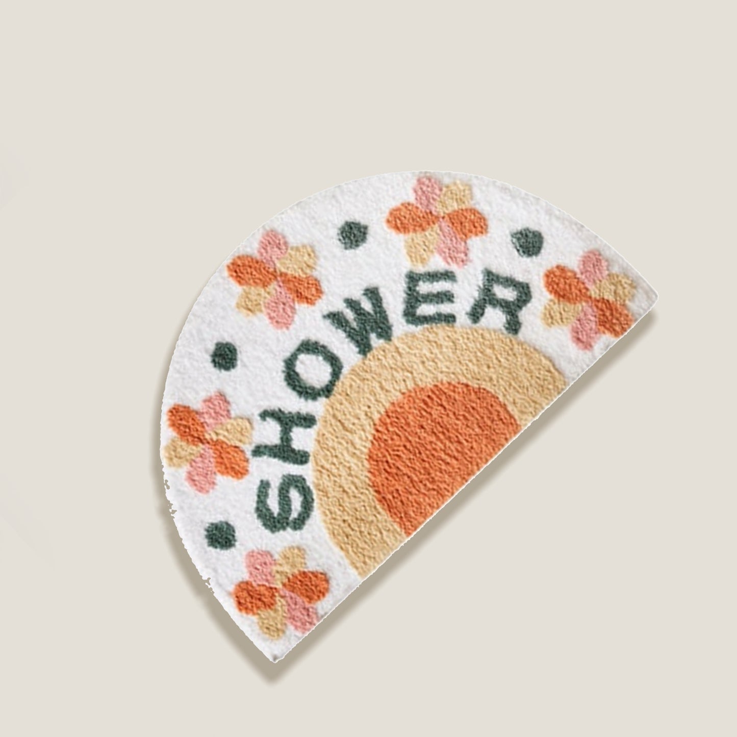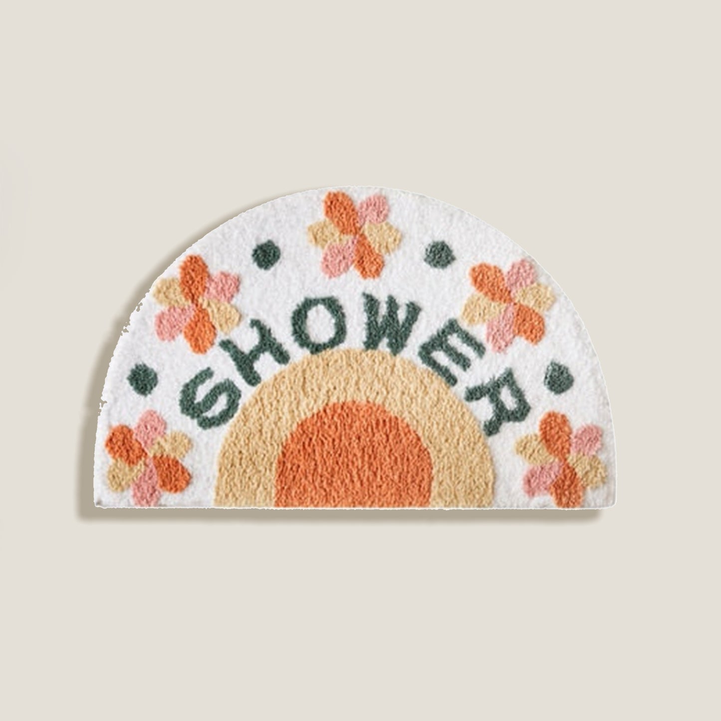 O tapete floral tem um lindo formato de semicírculo com uma textura macia e fofa e um padrão de flores.